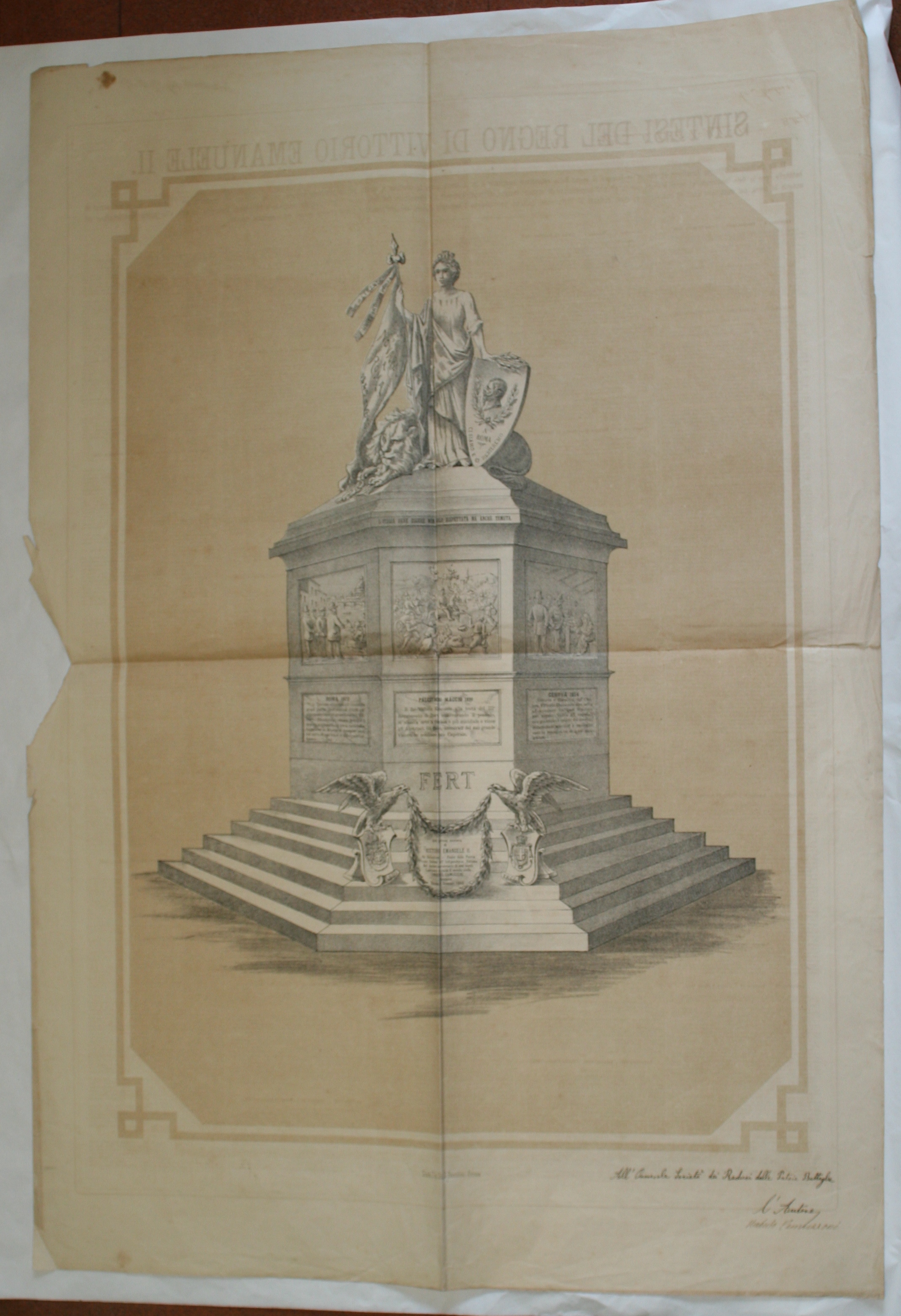 - Documento su due fronti: sul davanti testo e sul retro litografia con il monumento a Vittorio Emanuele II con gli episodi della sua vita