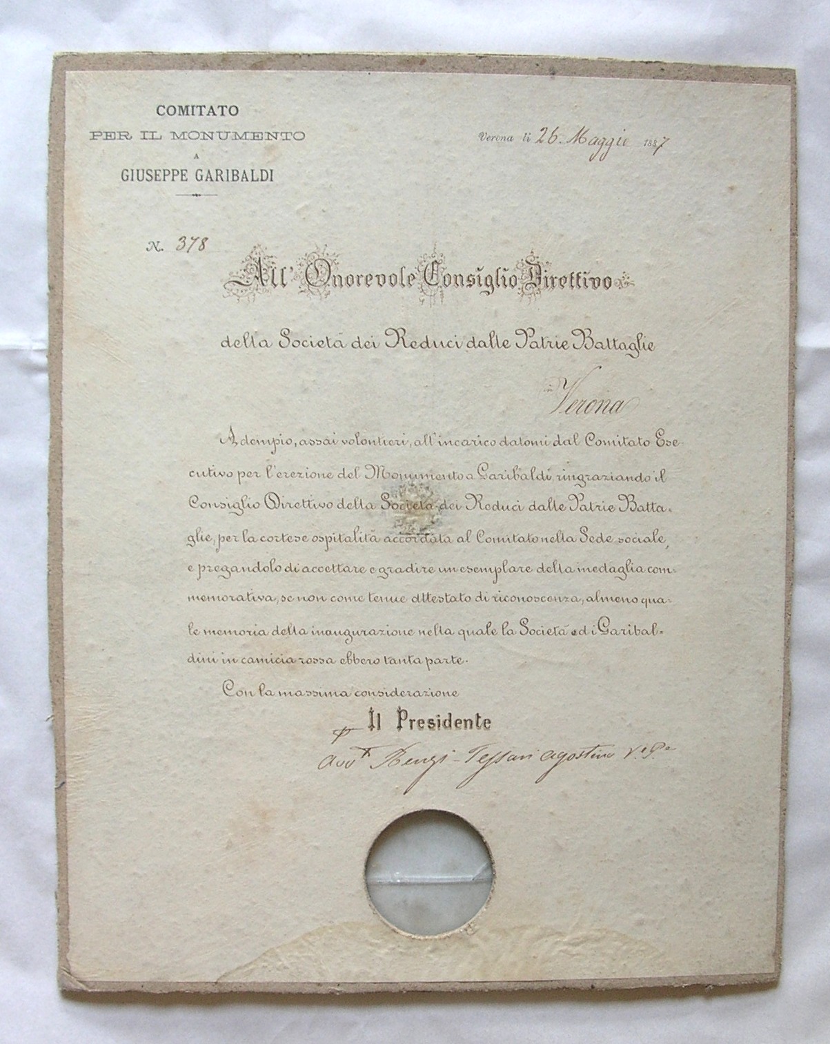 - Documento applicato su supporto in cartoncino; in basso foro con vetro per contenere la medaglia.
