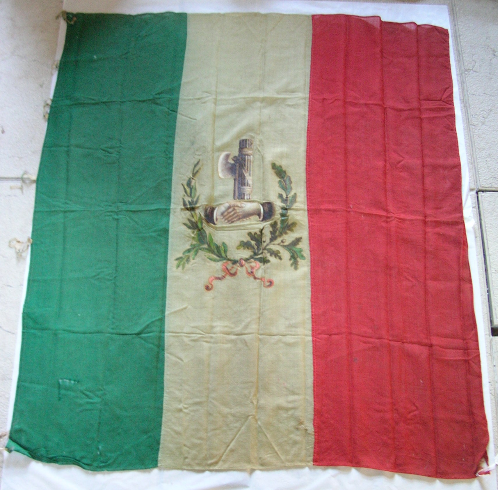 - Bandiera italiana con dipinto nella zona centrale lo stemma della Società di Mutuo Soccorso (due mani che si stringono entro due rami di alloro e quercia legati tra loro da un nastro) e il fascio littorio