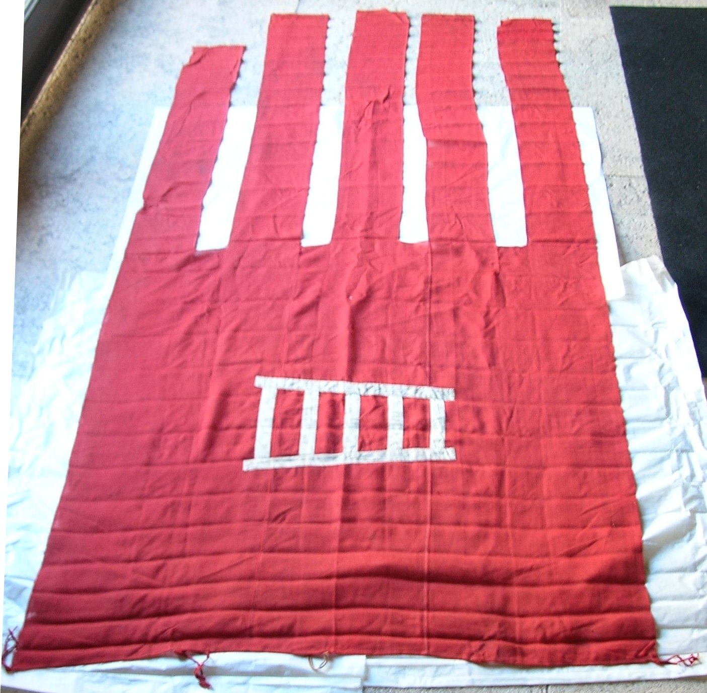 - Lino. Fondo rosso con al centro rappresentata una scala in tessuto ecrù applicata in senso orizzontale . Il fondo nella parte terminale è suddiviso in quattro fasce distaccate.