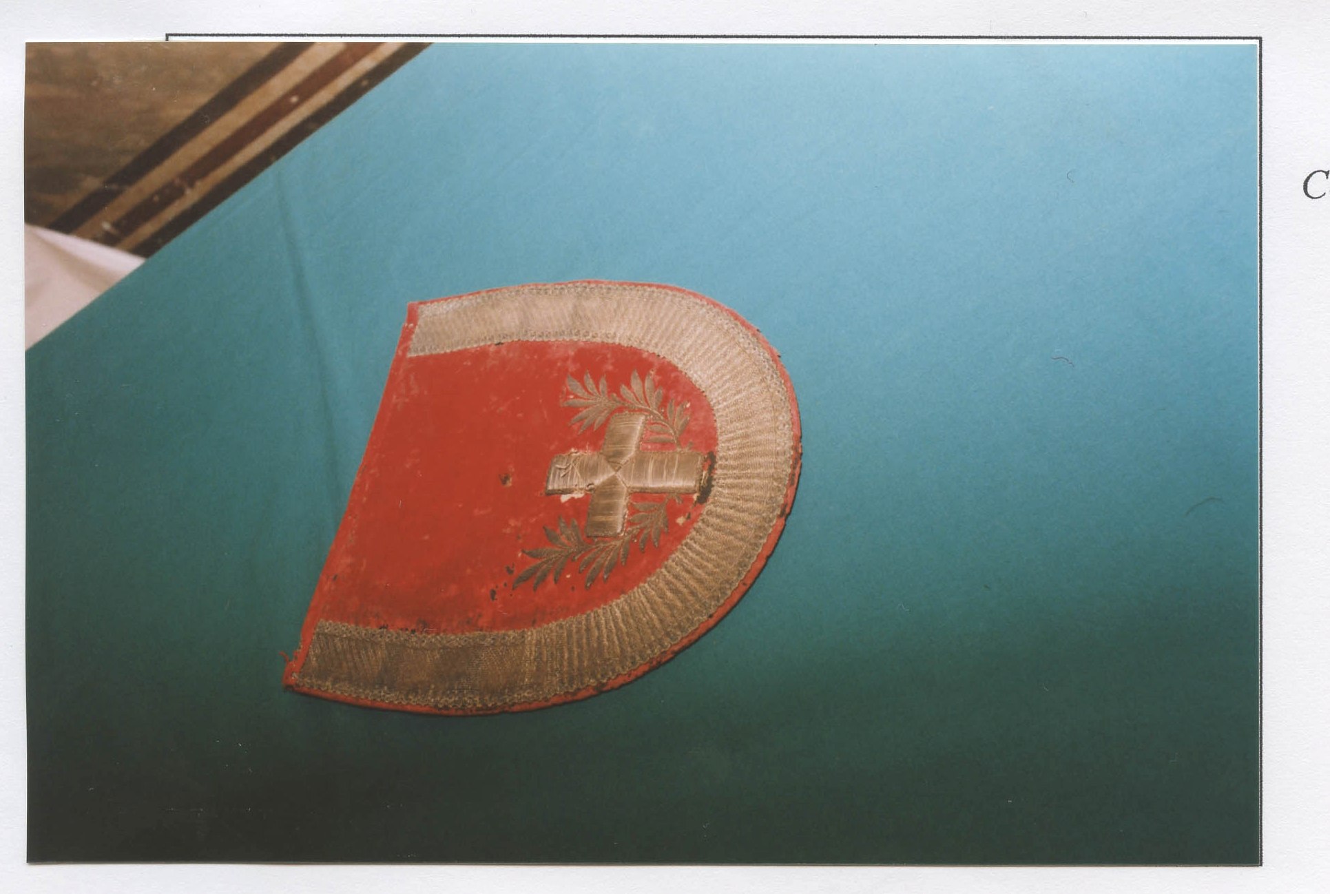 - Copritasca ricamata con filato metalico dorato con poratura consunta rappresentante una croce a rilievo affiancata da racemi.