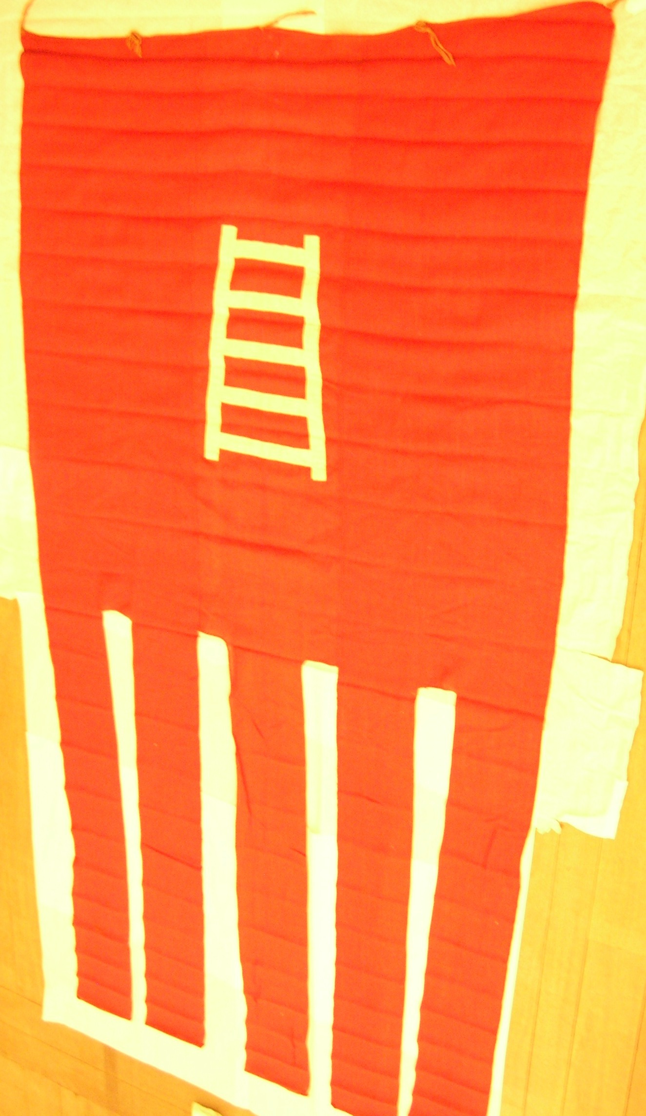 - Lino. Fondo rosso con al centro rappresentata una scala in tessuto ecrù applicato. Il fondo nella parte terminale è suddiviso in cinque fasce distaccate.