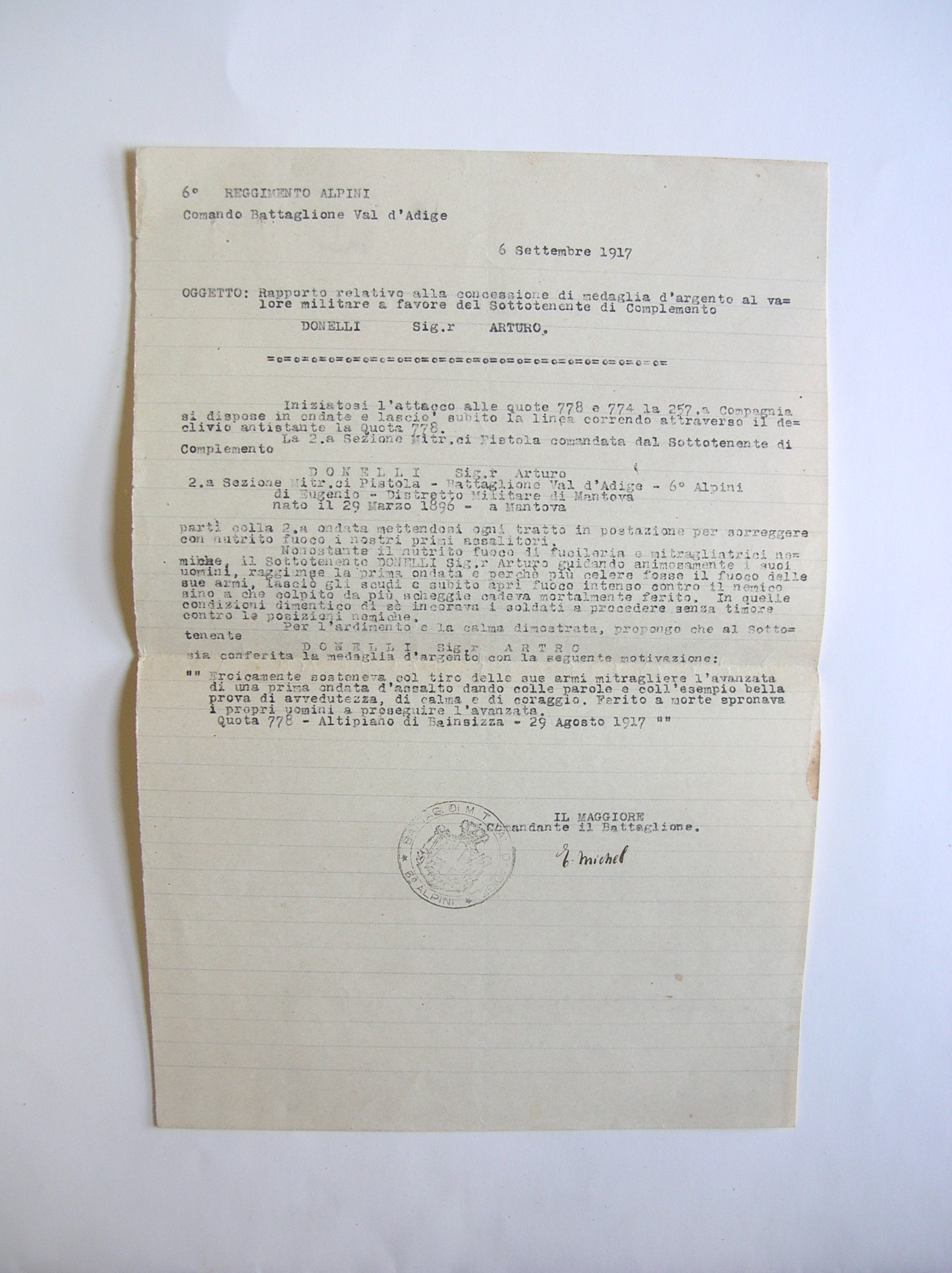 - In basso, timbro a inchiostro: "BATTAG. DI M. T. VAL D'ADIGE - 6° ALPINI".