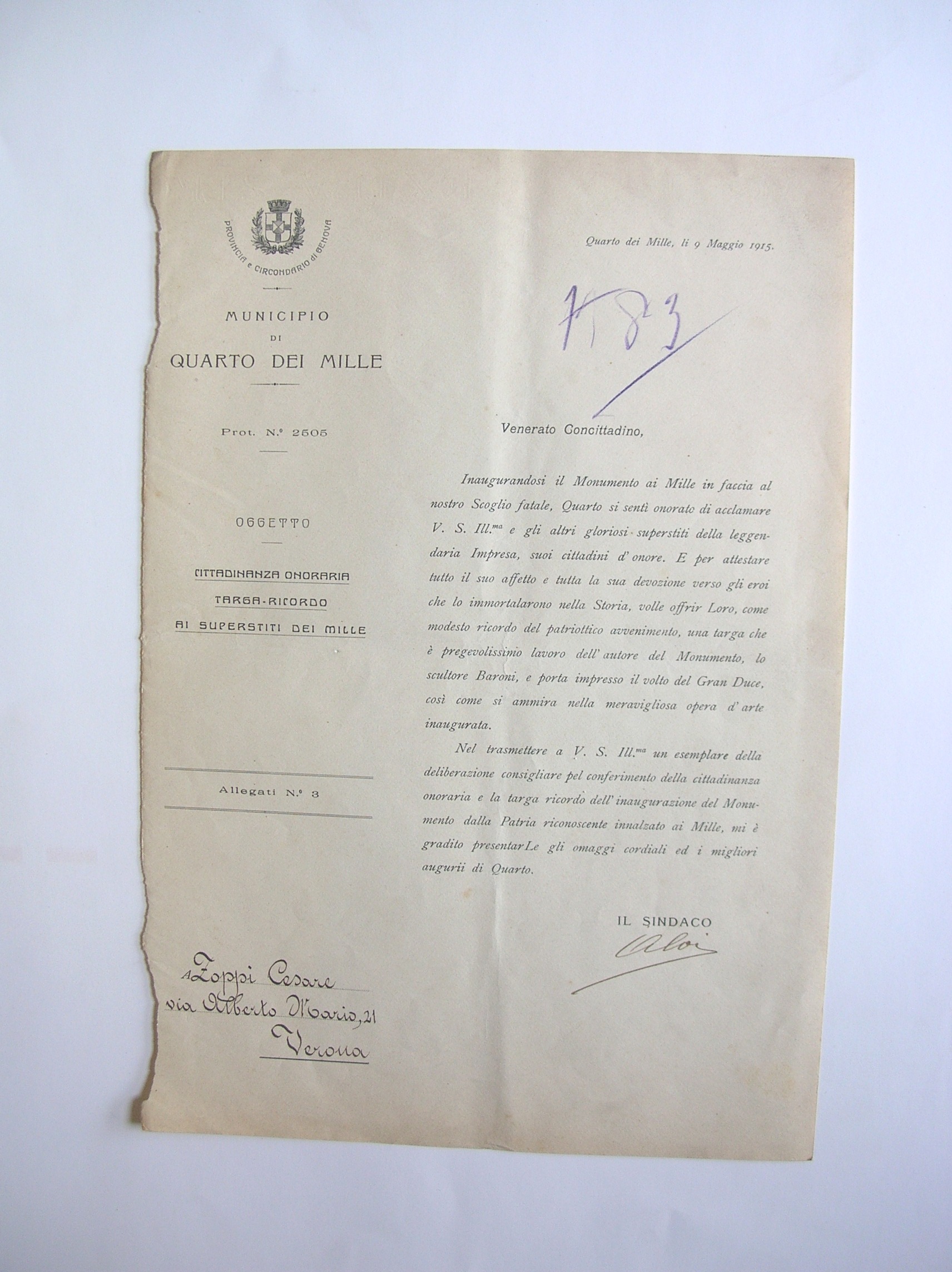 - Conferimento a Cesare Zoppi della cittadinanza onoraria a Quarto dei Mille e la targa ricordo dell'inaugurazione del monumento della patria