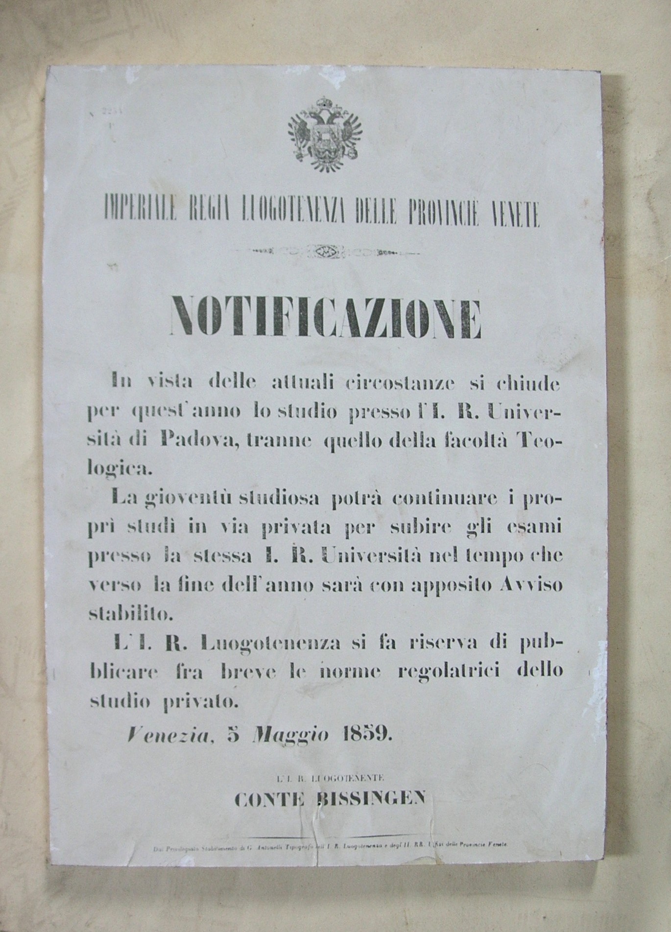 - Notificazione circa la chiusura dell'Università di Padova