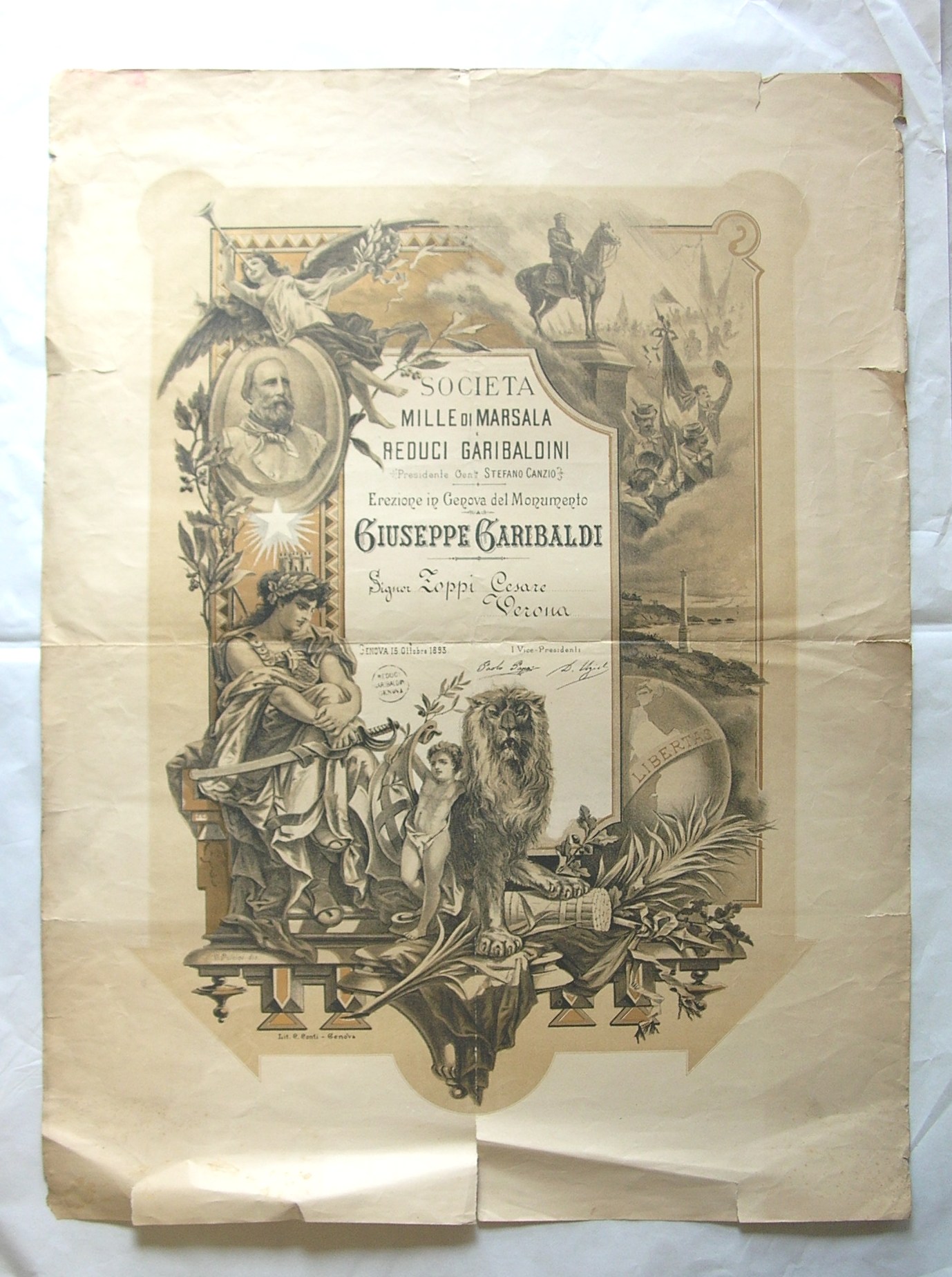 - Conferimento in occasione della festa dell'inaugurazione del monumento a Gardibaldi a Genova da parte del Società Mille di Marsala alla Cesare Zoppi