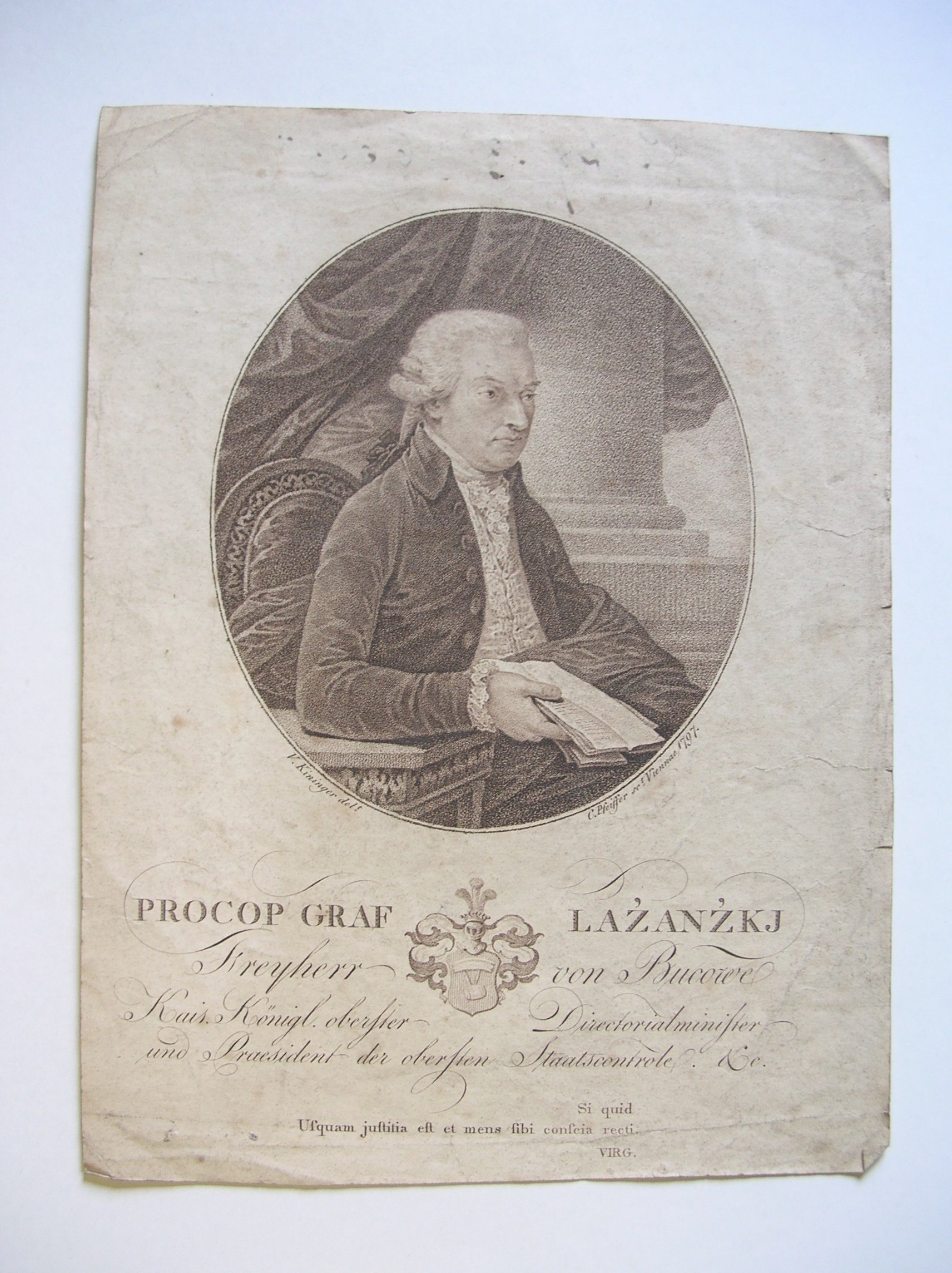 - Sotto l'immagine: "V. Kiniger del.t", "C. Pfeiffer sc.t Viennae 1797", "PROCOP GRAF LAZANZKY" ," Freyherr von Bucowe, Kais. Konigl. Oberster Directiorialminister uno Praesident der Staatscontrole. Etc.". "Si quid/ Usquam justitia est et mens sibi conscia recti./ VIRG.".