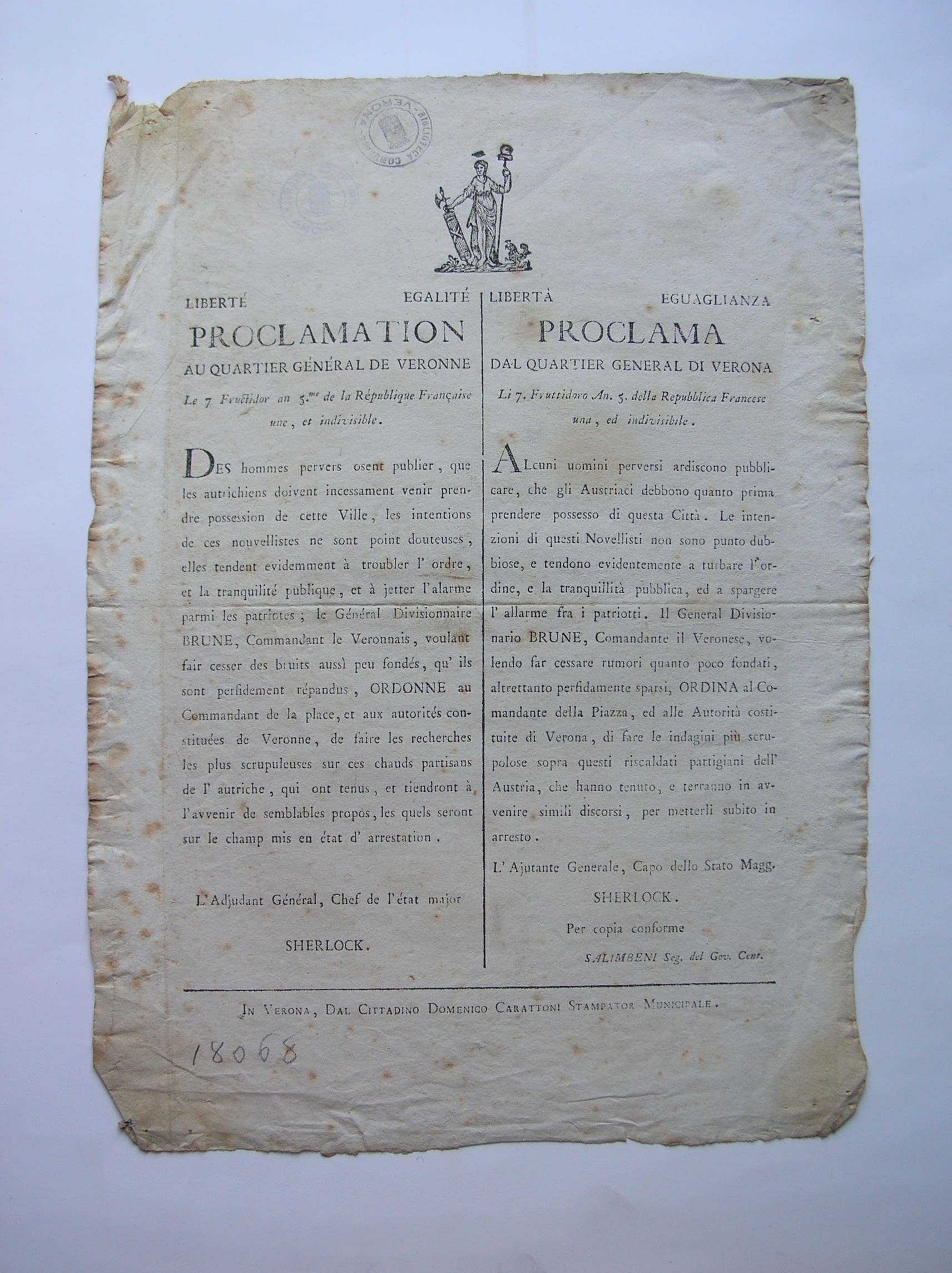 - Proclama bilingue di Sherlock circa l'ordine del Generale Divisionario Brune alle autorità di Verona di fare idagini sui partigiani dell'Austria