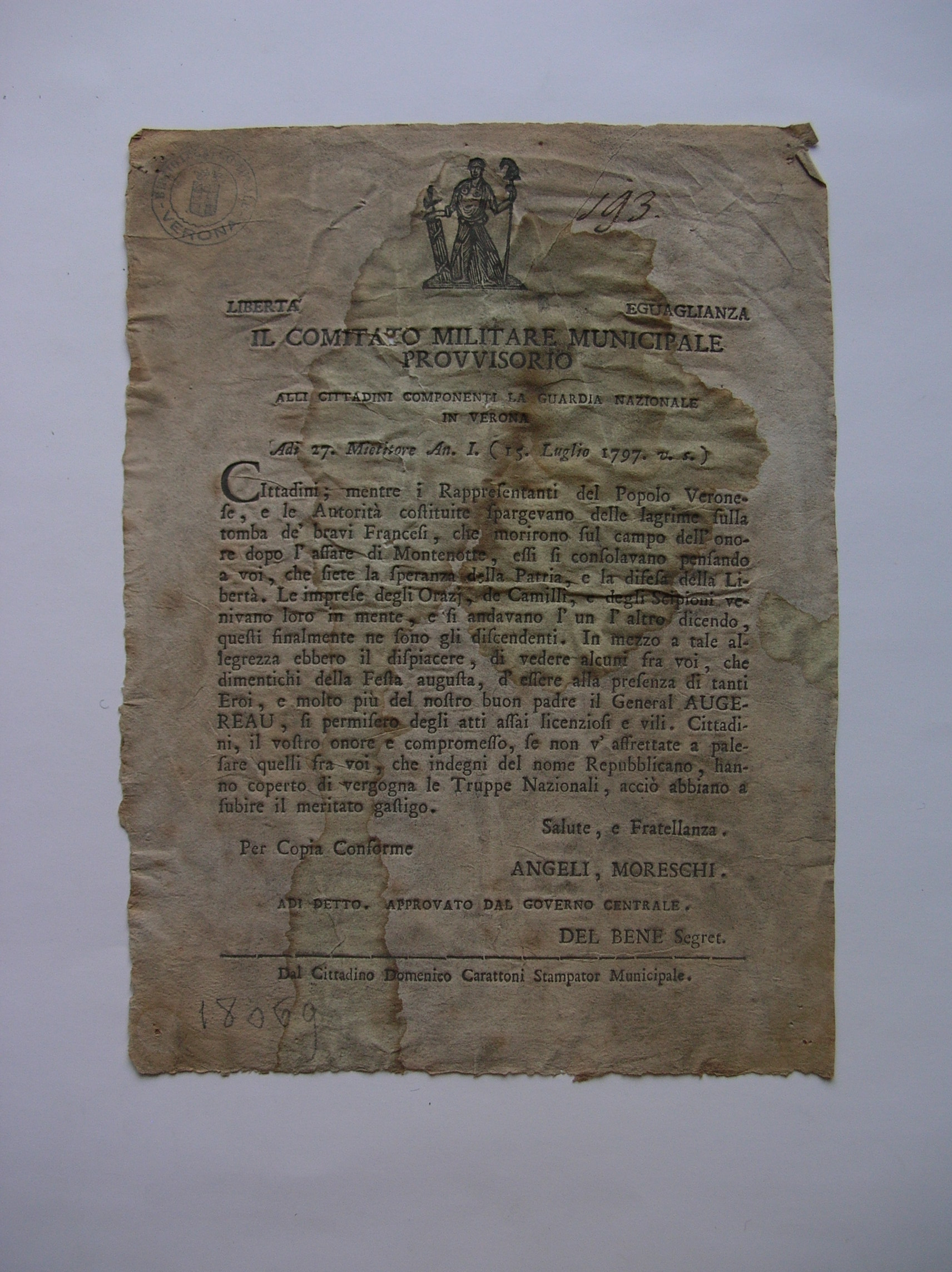 - Avviso del Comitato Militare Municipale provvisorio alla Guardia Nazionale di Verona circa la denuncia di atti licenziosi e vili durante la commemorazione dei caduti francesi nella Battaglia di Montenotte (11-12 aprile 1796)