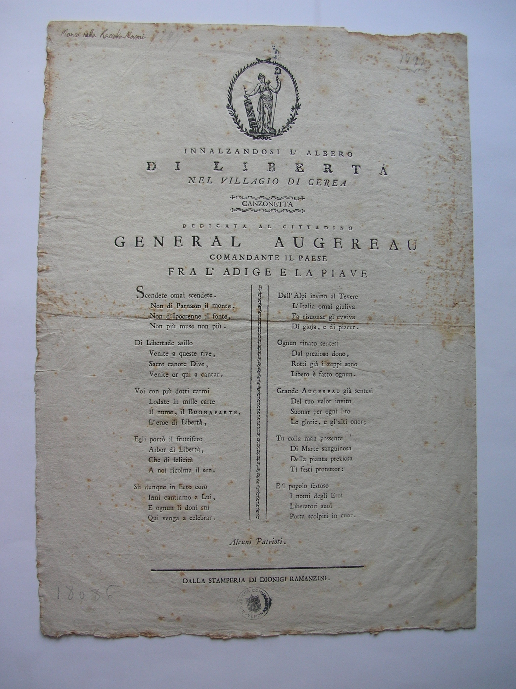- Componimento sull'erezione dell'Albero della Libertà a Cerea, dedicato al Generale Divisionario Augereau (1757-1816)