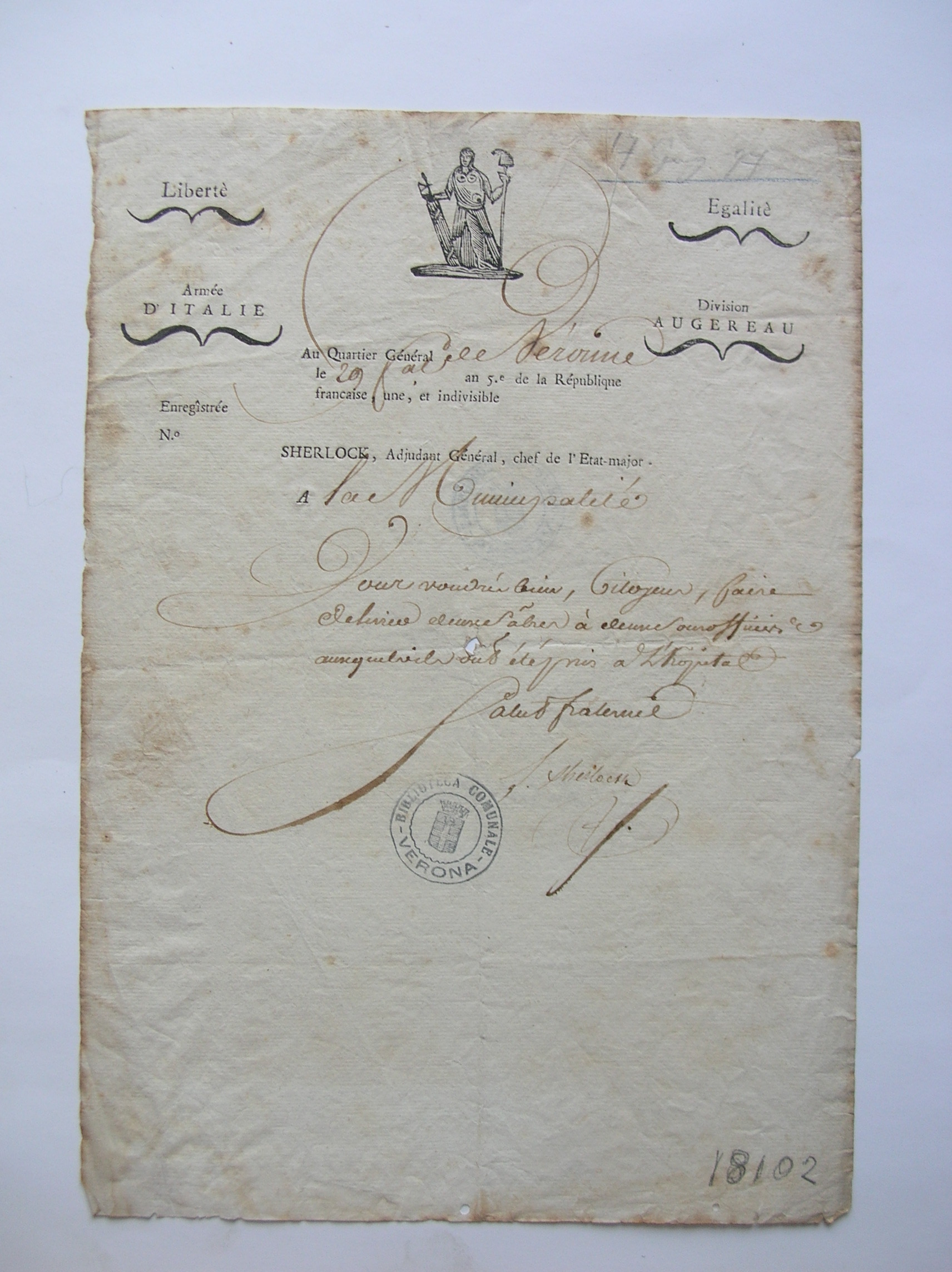 - Avviso in francese della Divisione Augereau (Armata d'Italia francese) al Quartier Generale di Verona