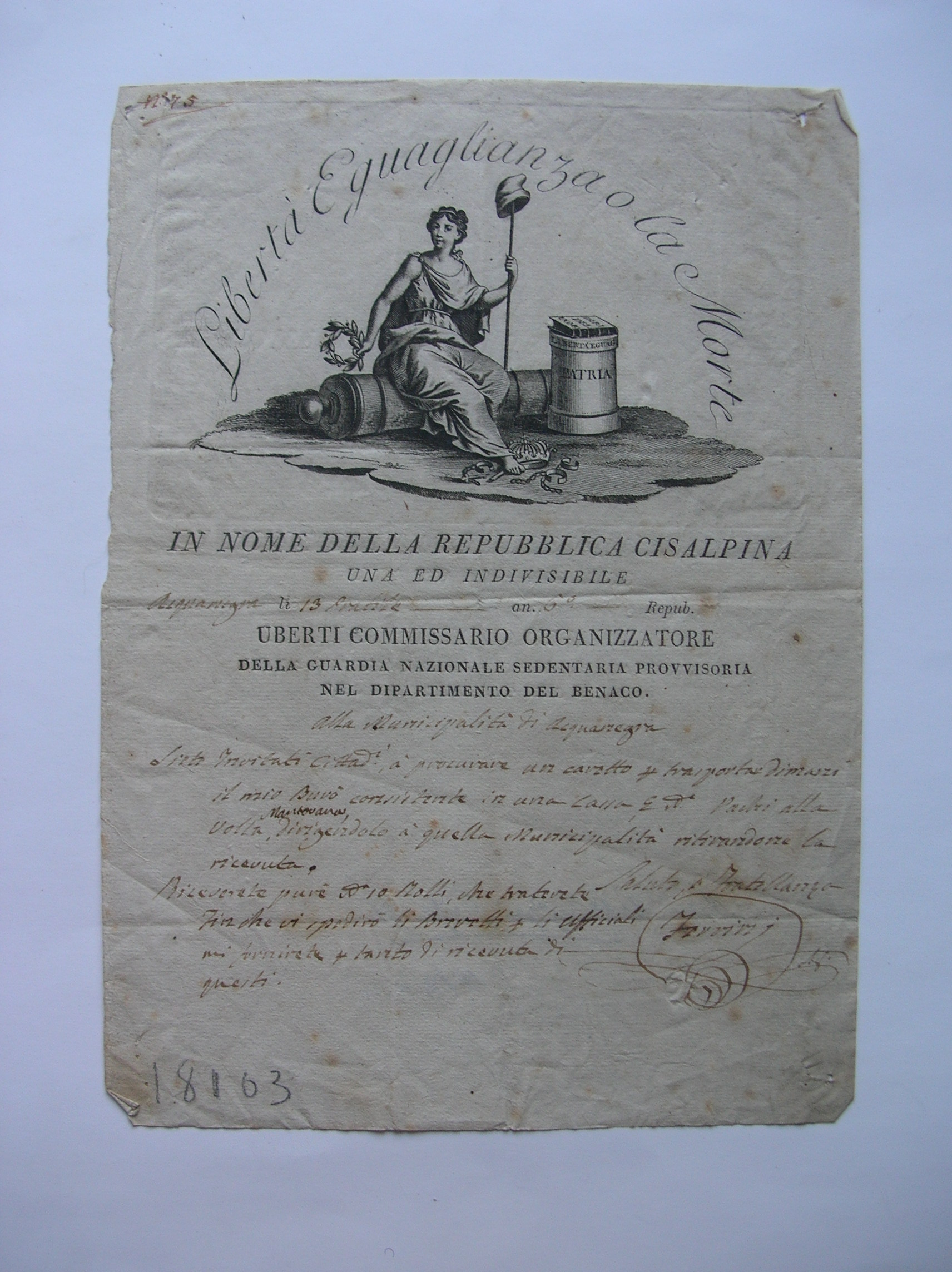 - Missiva di Uberti, Commissario Organizzatore della Guardia Nazionale sedentaria provvisoria (Dipartimento Benaco), alla Municipalità di Acquanegra: richiesta di un carretto per il trasporto mobile a Volta Mantovana