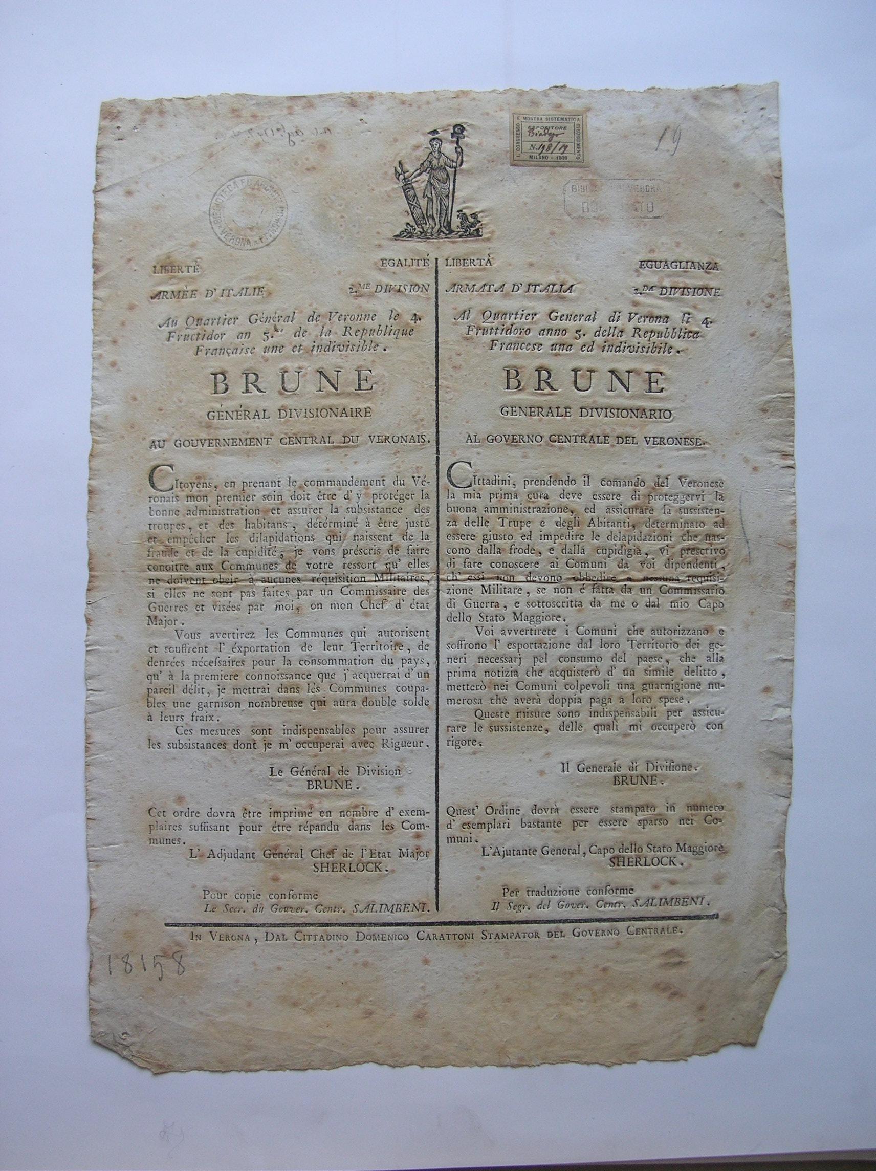 - Sotto l'effige repubblicana: a sinistra, "LIBERTE'", "EGALITE'"; a destra, "LIBERTA'", "EGUAGLIANZA". In alto asinistra, timbro a inchiostro: "BIBLIOTECA E ARCHIVI COMUNALI - VERONA". In altro a destra, timbro a inchiostro: "BIBLIOTECA DI VERONA/DUPLICATO"