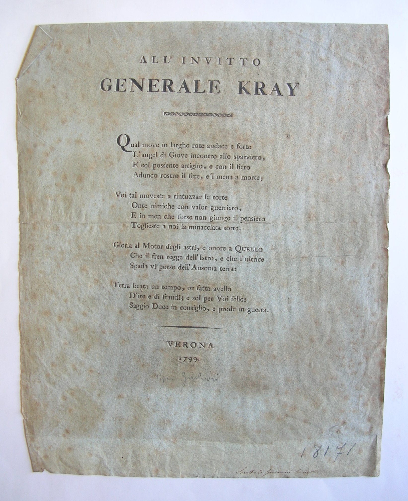 In calce: "VERONA 1799" ; a matita: "Tip. Giuliari", "18171" e a penna: "Sonetto di Giovanni Canella" - NOTE