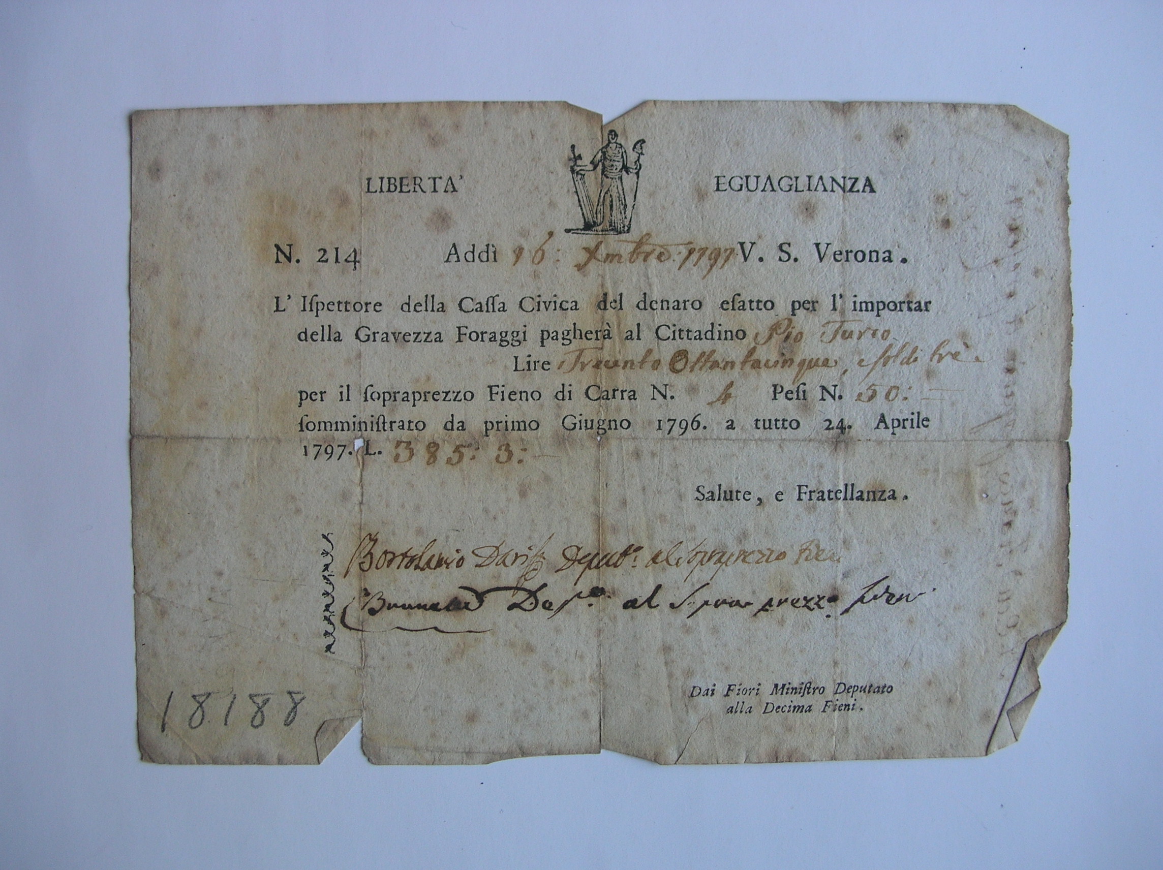 - Bollo repubblicano n. 214 relativo al pagamento di £ 385,30 da parte della Cassa Civica al cittadino Pio Turco per sovrapprezzo sul fieno
