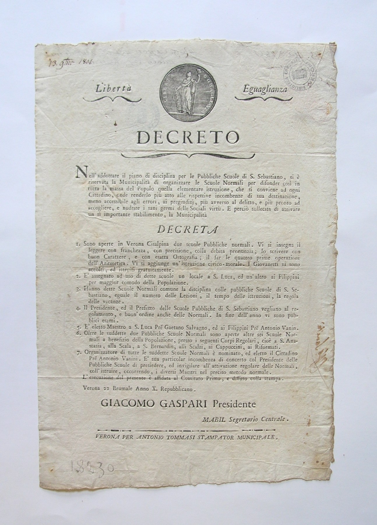 - Decreto circa l'istituzione di Scuole Pubbliche Normali per diffondere l'istruzione elementare
