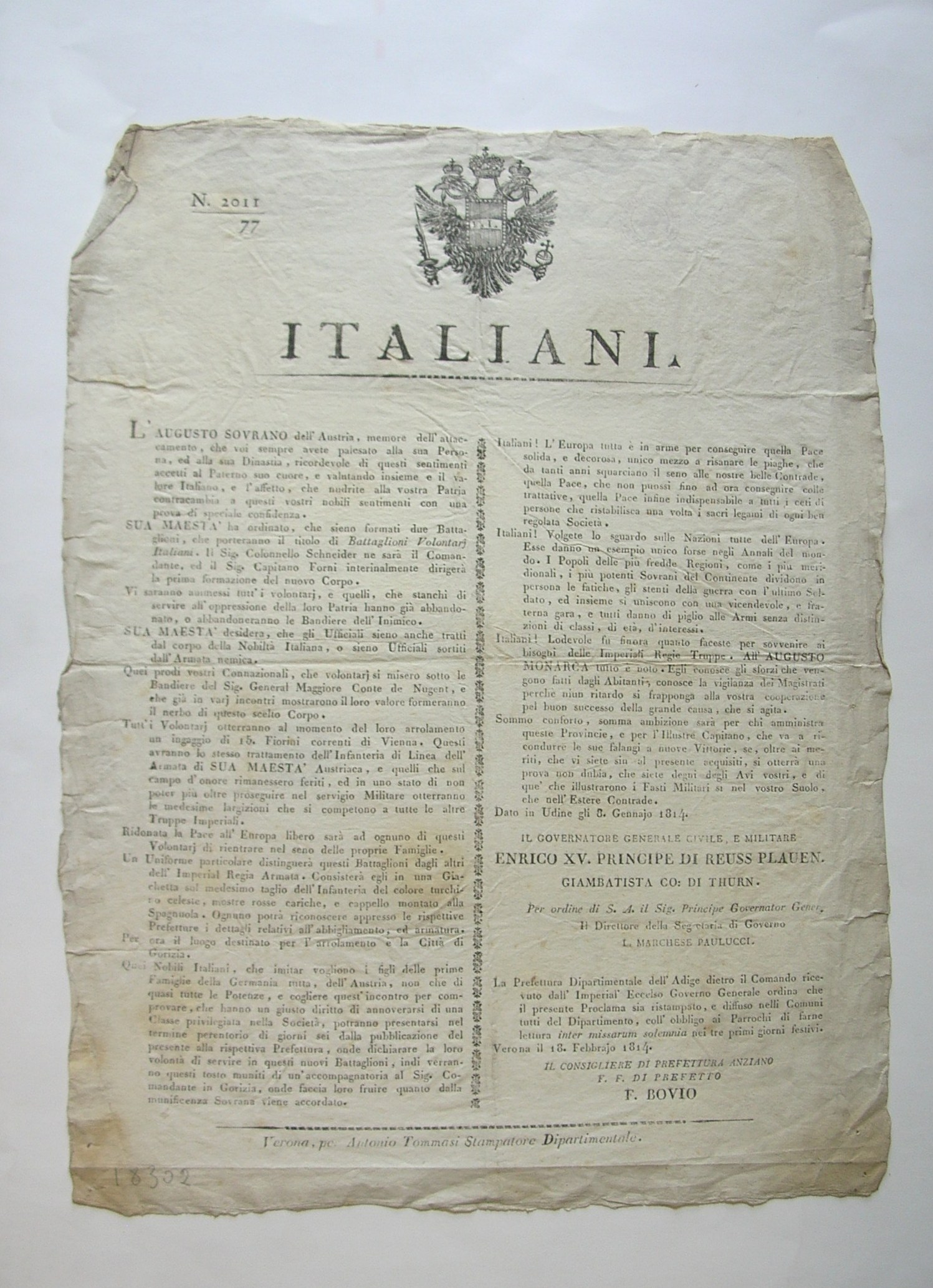 Sul retro, a matita: "1814 Febbrajo 18", "Due Battaglioni Volontari", "1814 Febb 18"; timbro a inchiostro: "Biblioteca Comunale - Verona" - DESCRIZIONE