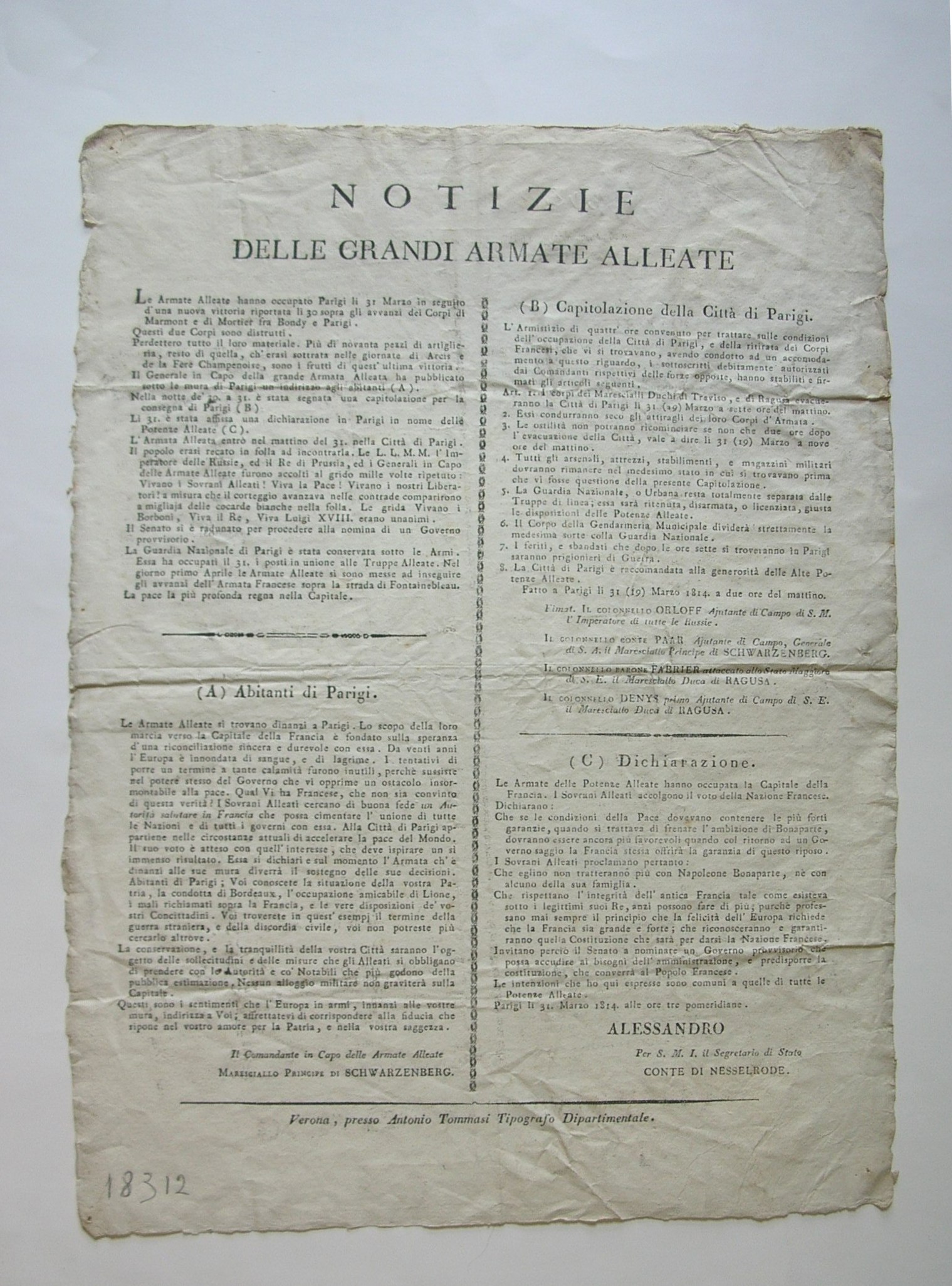 Sul retro, a matita,:"1814 Marzo 31"; a penna: "Proclama 31 Marzo 1814", "Stampato e pubblicato in Verona li 11 Aprile 1814"; timbro a inchiostro: "Biblioteca Comunale - Verona" - NOTE