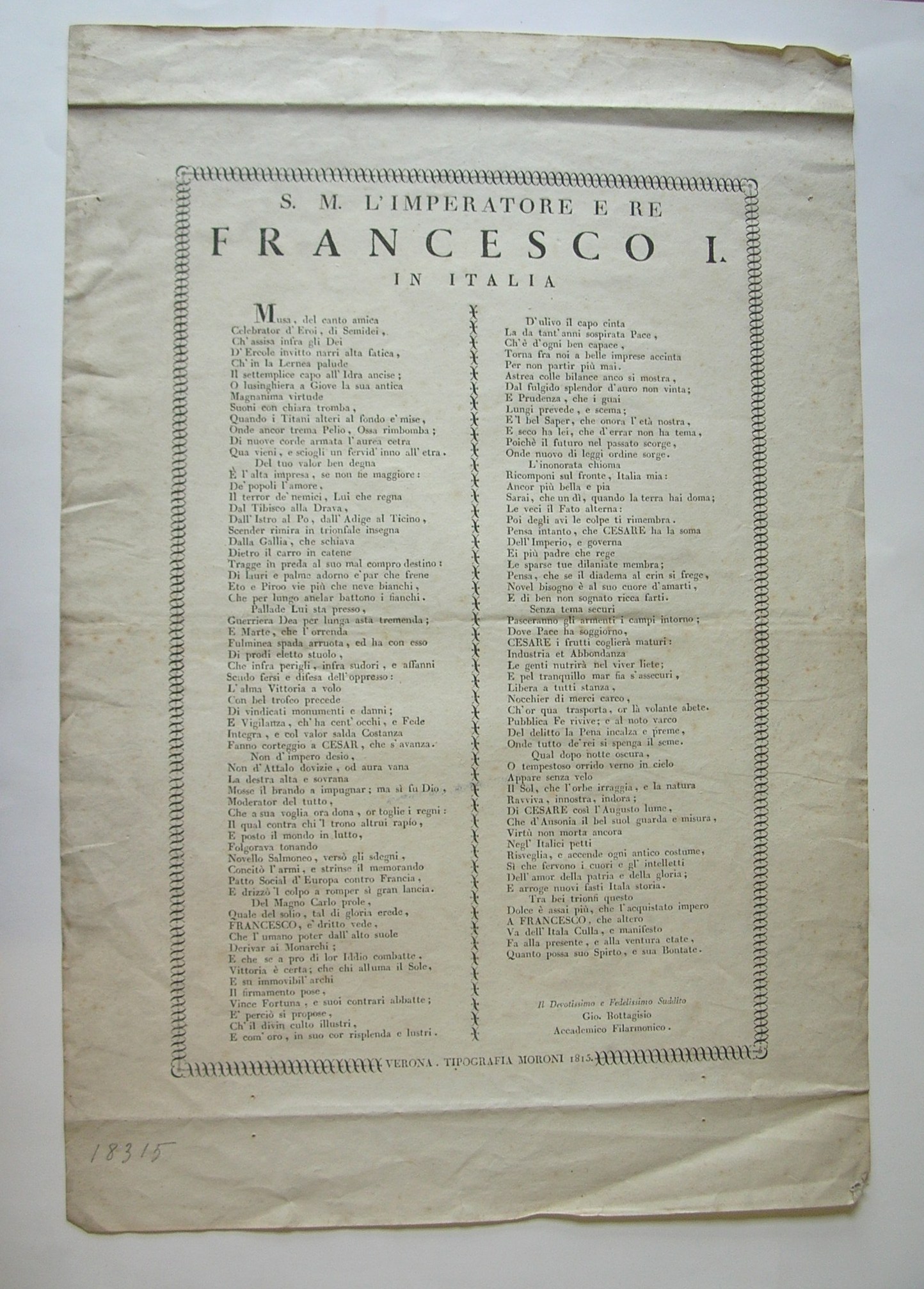 - In calce: "VERONA. TIPOGRAFIA MORONI 1815."; a matita: "18315".