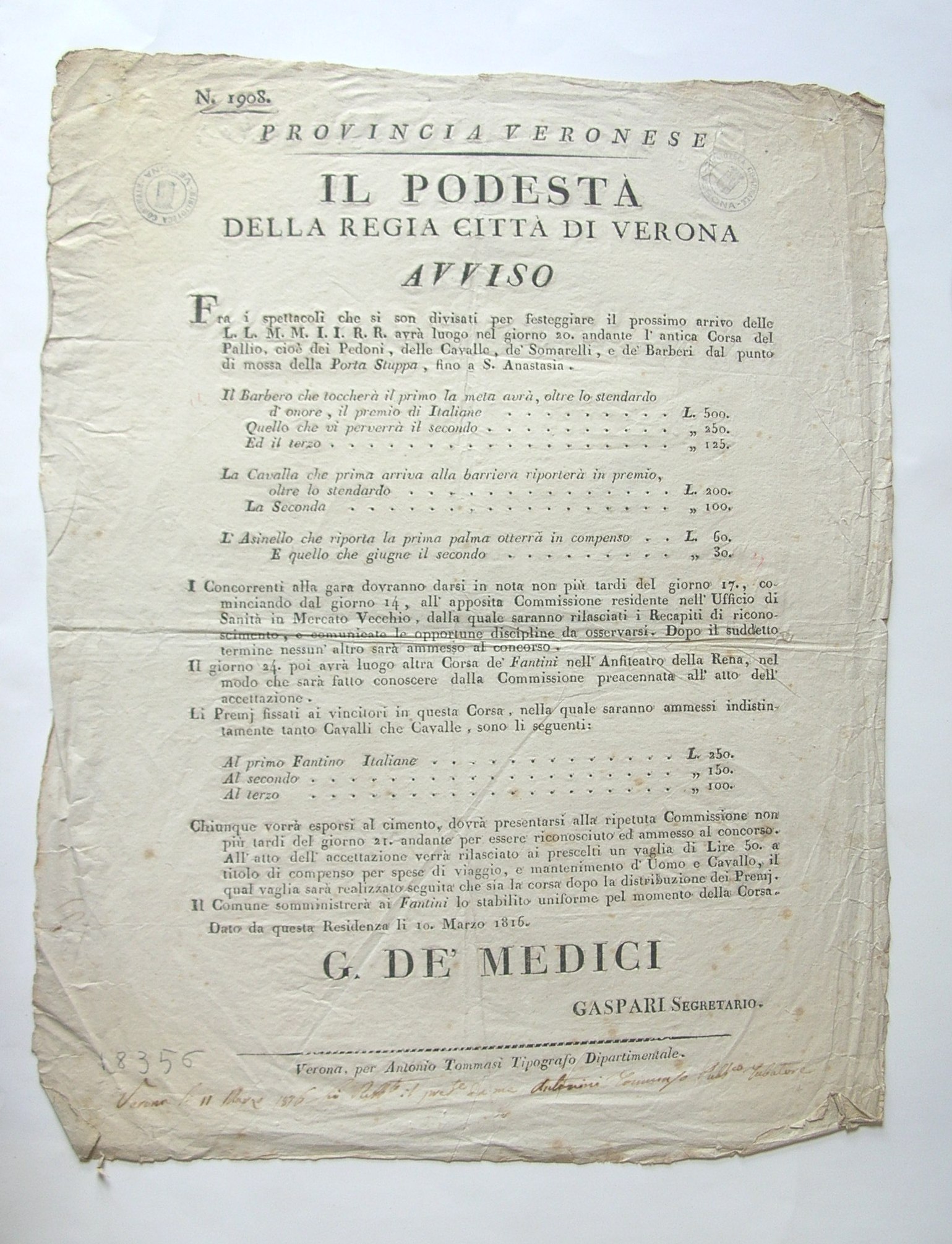- Avviso del Podestà di Verona circa la corsa del Palio del 20 Marzo 1816
