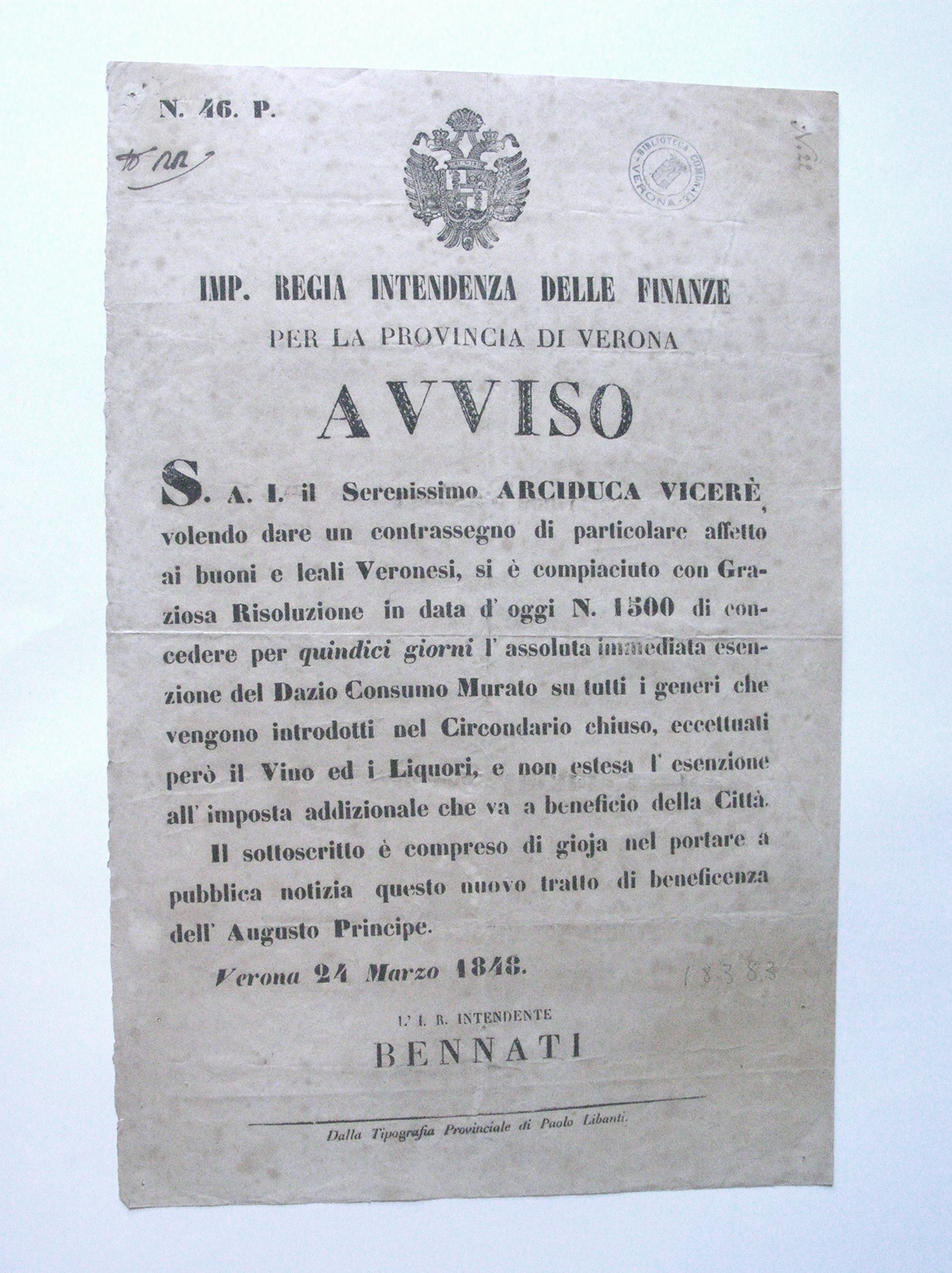 - Avviso della Imperial Regia Intendenza delle Finanze circa l'esenzione dei dazi per 15 giorni, per tutti i beni eccetto vino e liquori