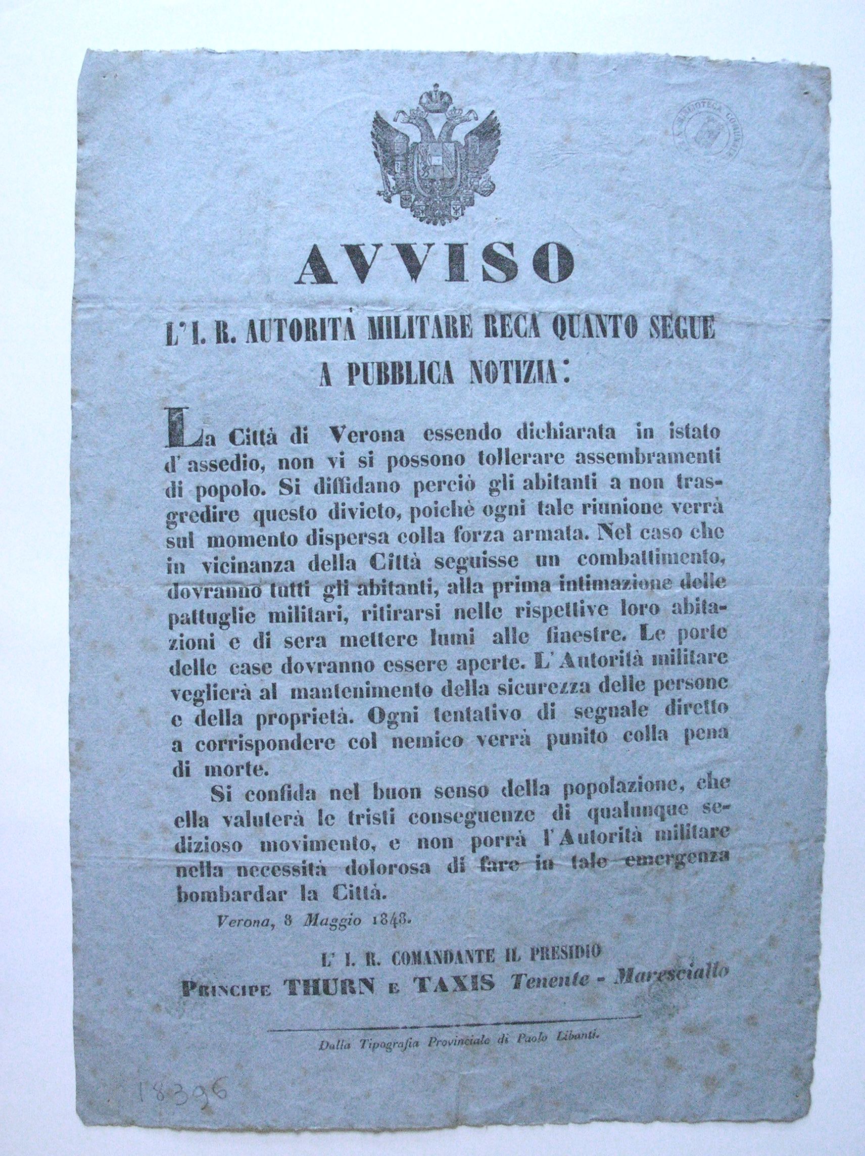 - Avviso dell'Autorità Militare circa lo stato d'assedio di Verona: divieto di assembramenti e di contatto con il nemico, pena bombardamenti