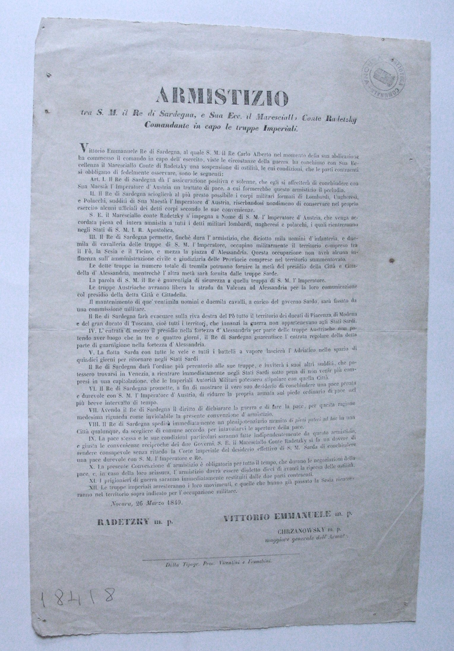 - Armistizio tra Radetzky e Vittorio Emanuele II (26 marzo 1849)