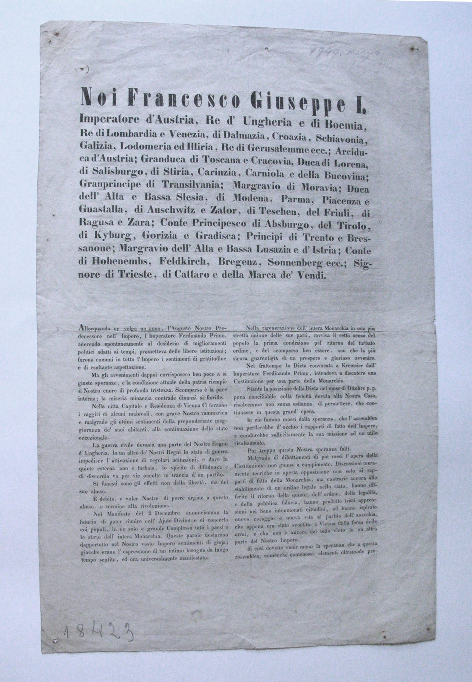 In calce, a matita: "18423" e sul retro, in calce: "Dalla Stamperia Imp. Reg." e a penna: "N° 5 cinque".