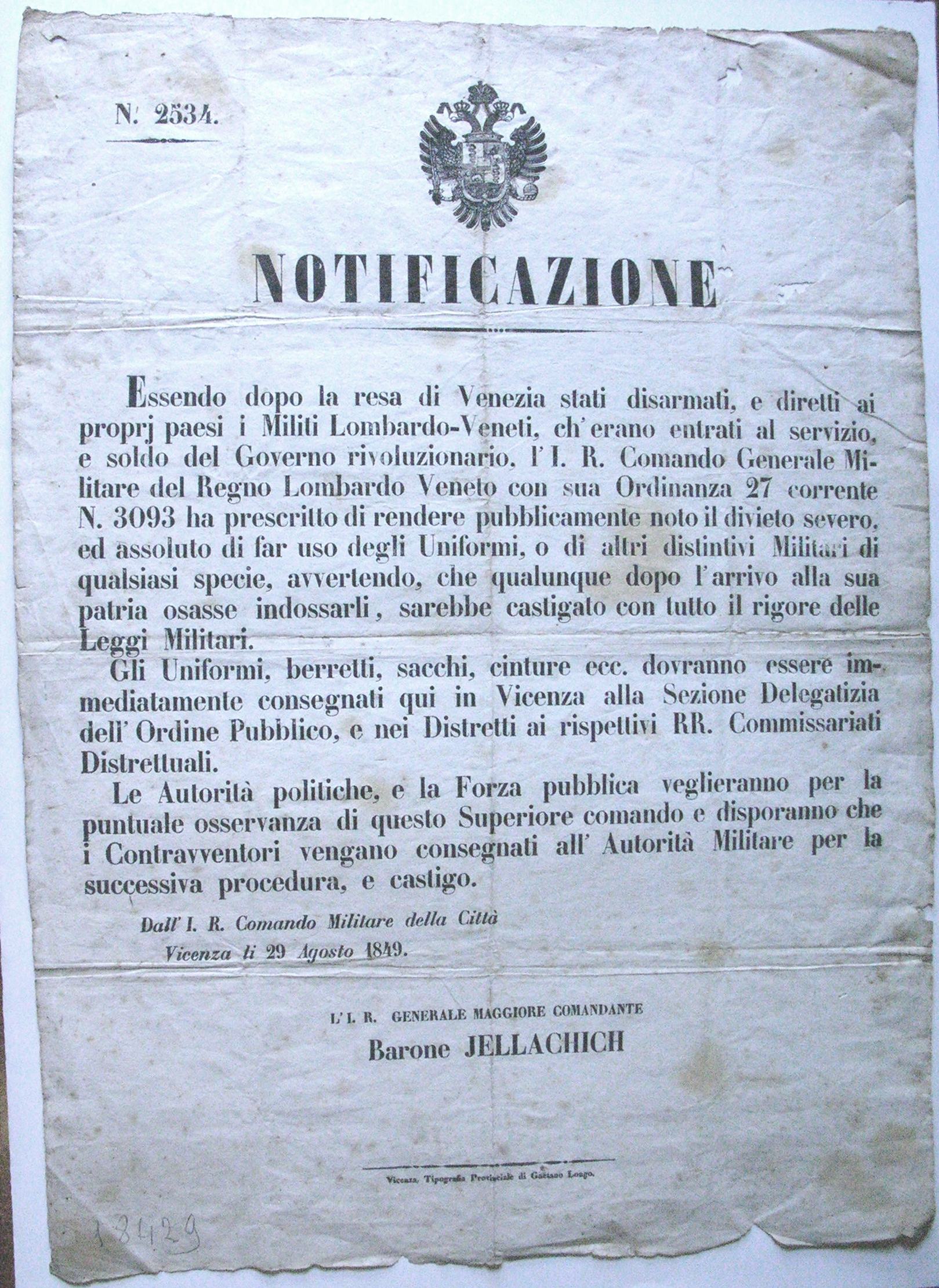 - In calce:"Vicenza, Tipografia Provinciale di Gaetano Longo"; a matita: "18429"