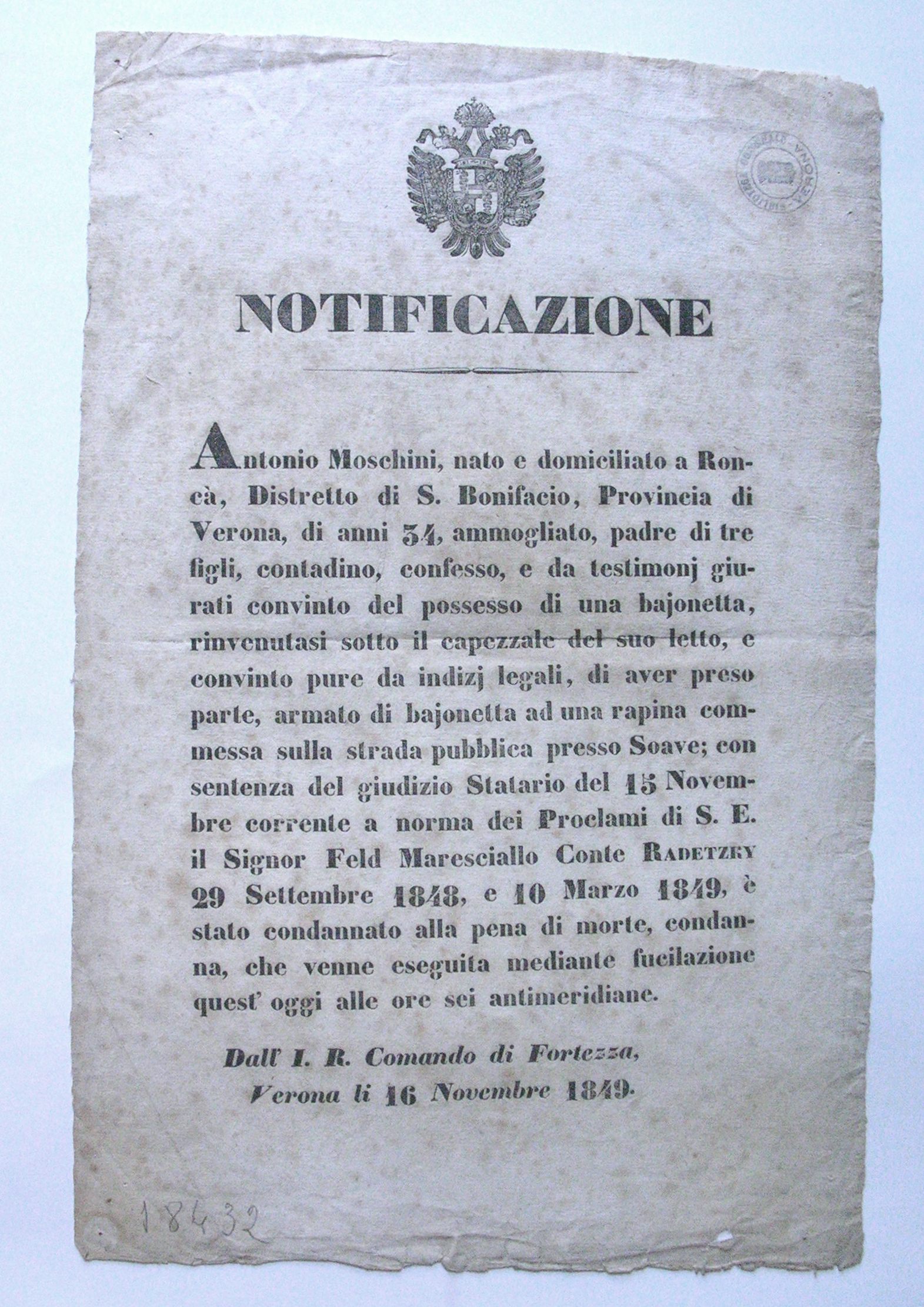 - Condanna a morte di Antonio Moschini per possesso di baionetta e per rapina sulla strada per Soave