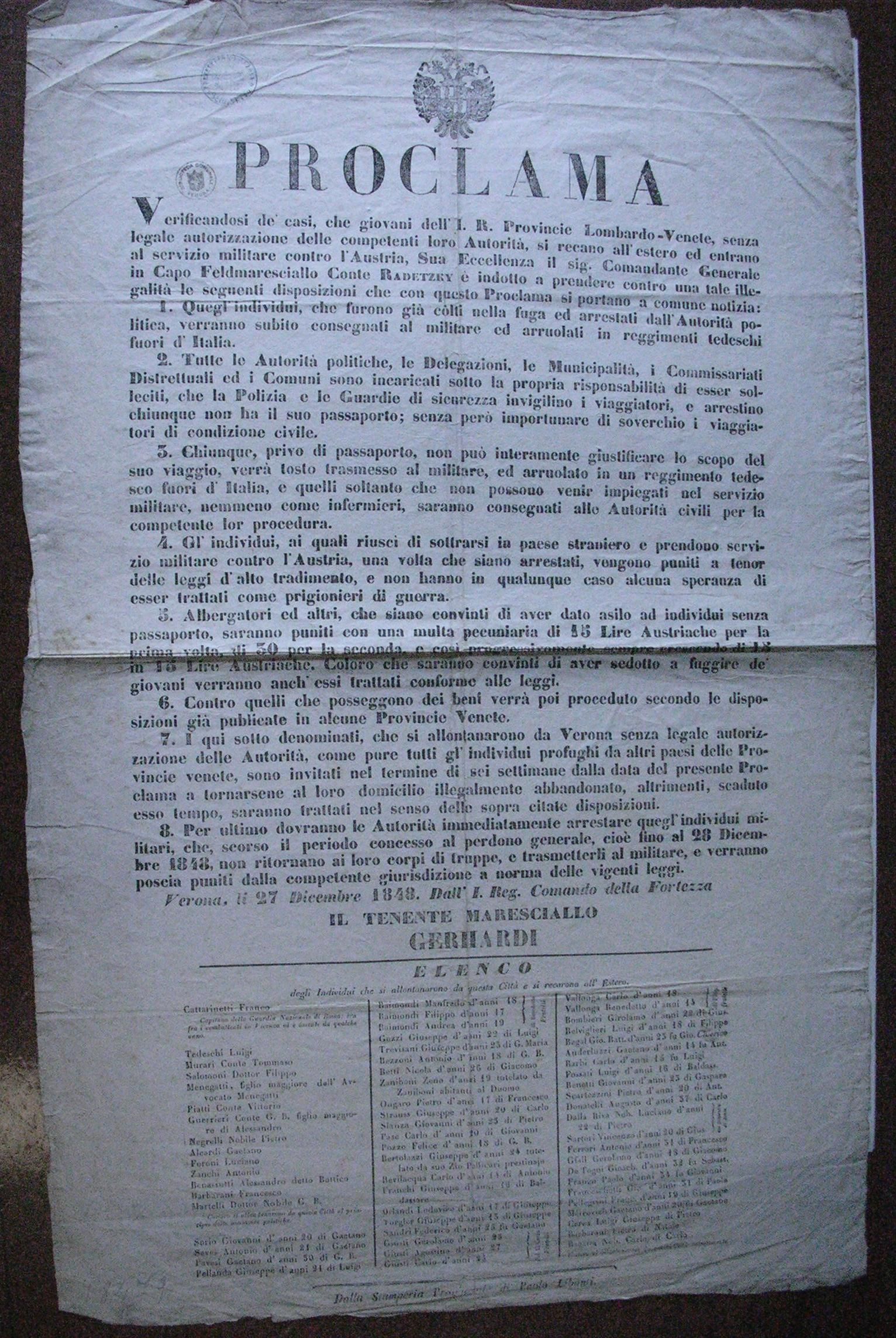 - Proclama di Radetzky circa i giovani che si recano all'estero ed entrano al servizio militare contro l'Austria: provvedimenti ed elenco delle persone che si allontanarono dalla cittą