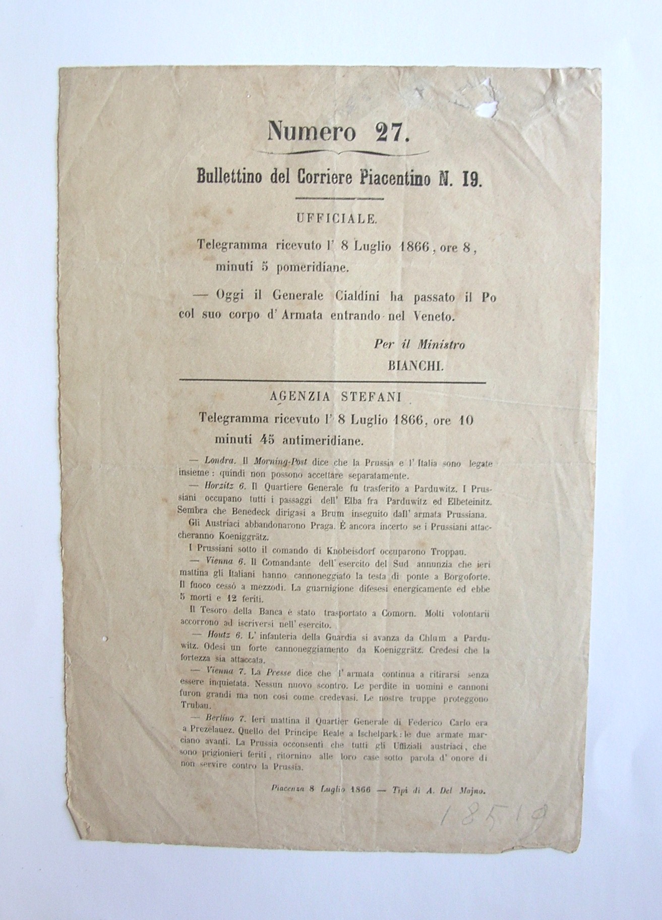 - In calce: "Piacenza 8 luglio 1866 - Tipi. Di A. Del Majno"; a matita: "18519".