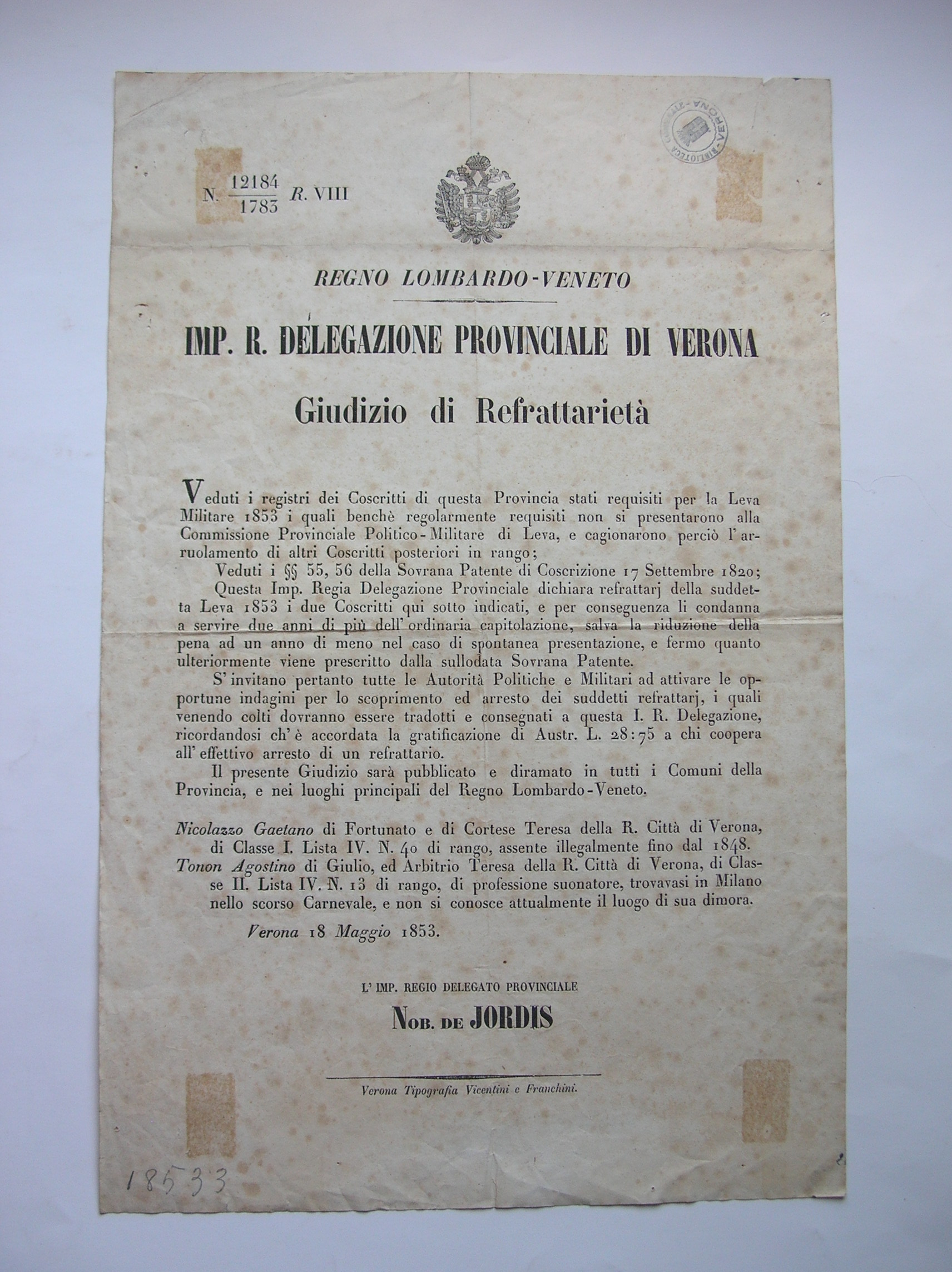 In calce: "Verona Tipografia Vicentini e Franchini"; a matita: "18533".