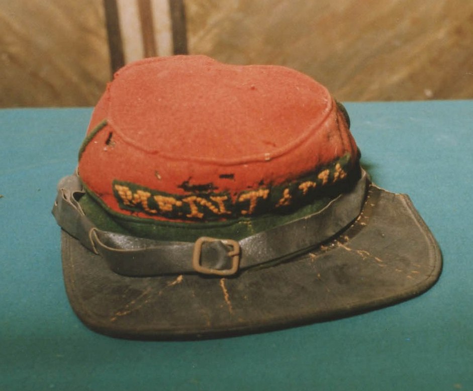 - Berretto in panno rosso con visiera in cartone pressato con l'iscrizione "MENTANA", ricamata con filo giallo su tessuto verde applicato.