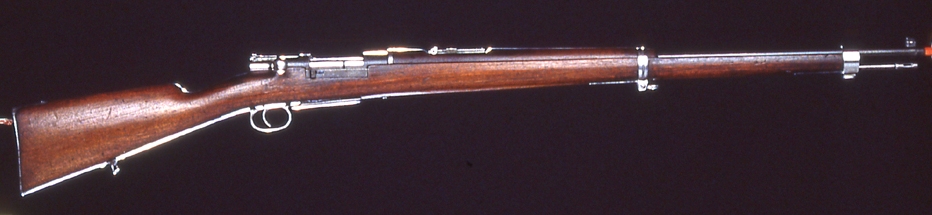- Fucile Mauser mod. 1893 dell'impero ottomano, preda bellica della guerra italo-turca del 1911-1912, calibro 7,65 x 53 mm. Arma a ripetizione ordinaria con otturatore Mauser e alimentazione a scatola-serbatoio sistema Mauser. La canna in acciaio è solcata da quattro righe destrorse. Esternamente la canna è tonda con culatta mobile e reca il mirino e l'alzo a ritto con cursore graduato in caratteri arabi. Il fermo della baionetta è ricavato sul bocchino sotto la canna. La culatta mobile è sagomata per ricevere l'otturatore di forma cilindrica, girevole e scorrevole con due alette di ritegno anteriori, ed estrattore rotante esterno al cilindro. La scatola-serbatoio bifilare a cinque cartucce è inserita nel fusto della cassa ed è provvista di un arresto di ripetizione per impedire il sollevamento delle cartucce e consentire il tiro a caricamento successivo. La cassa e il copricanna sono in legno di noce e i fornimenti sono in ferro.