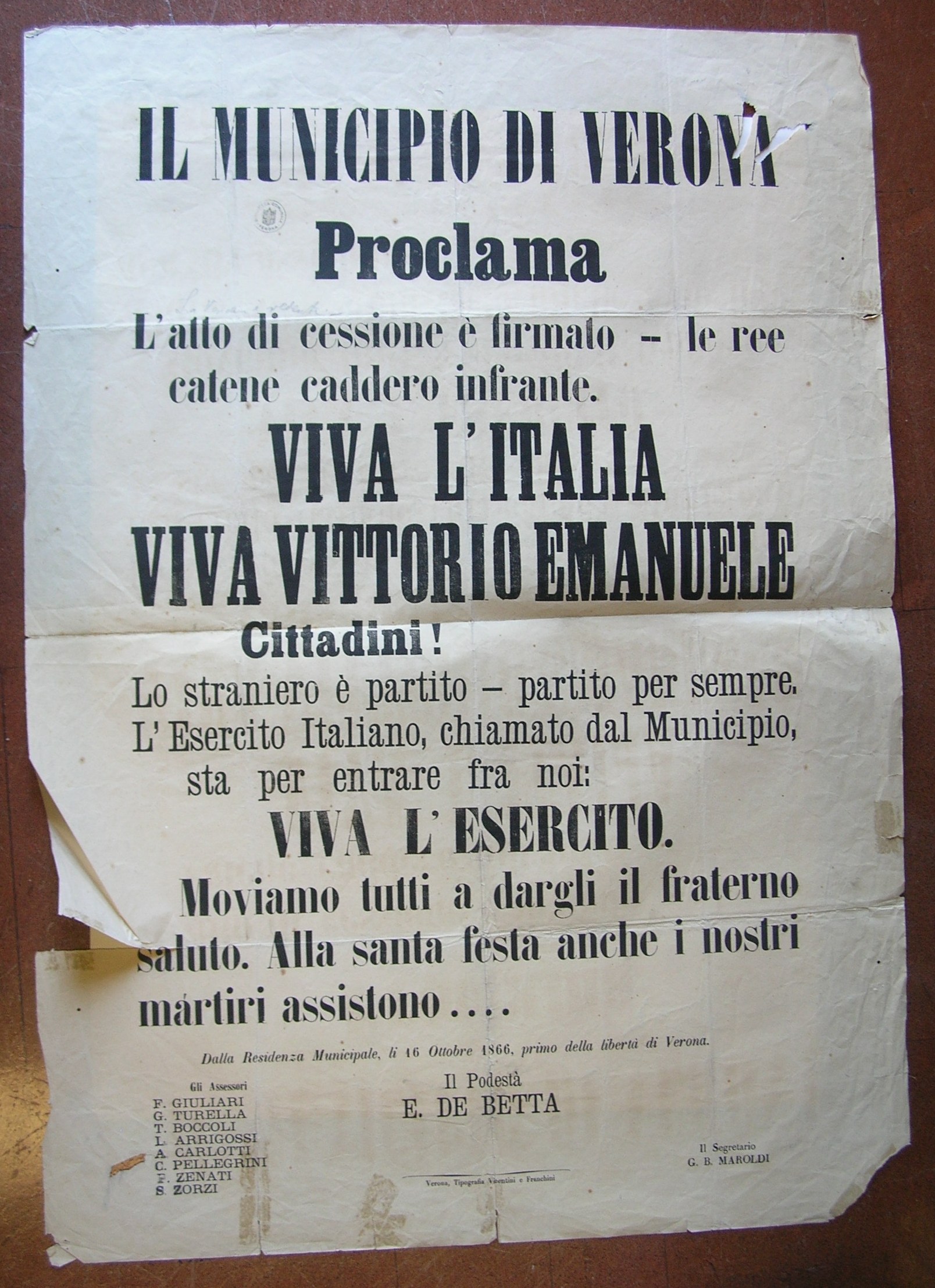 Sul retro, a matita: "1866 ott 16", "Fondo De Betta"; a penna: "8.3", "19507 / 9C859"; timbro a inchiostro: "Biblioteca Comunale - Verona" - NOTE
