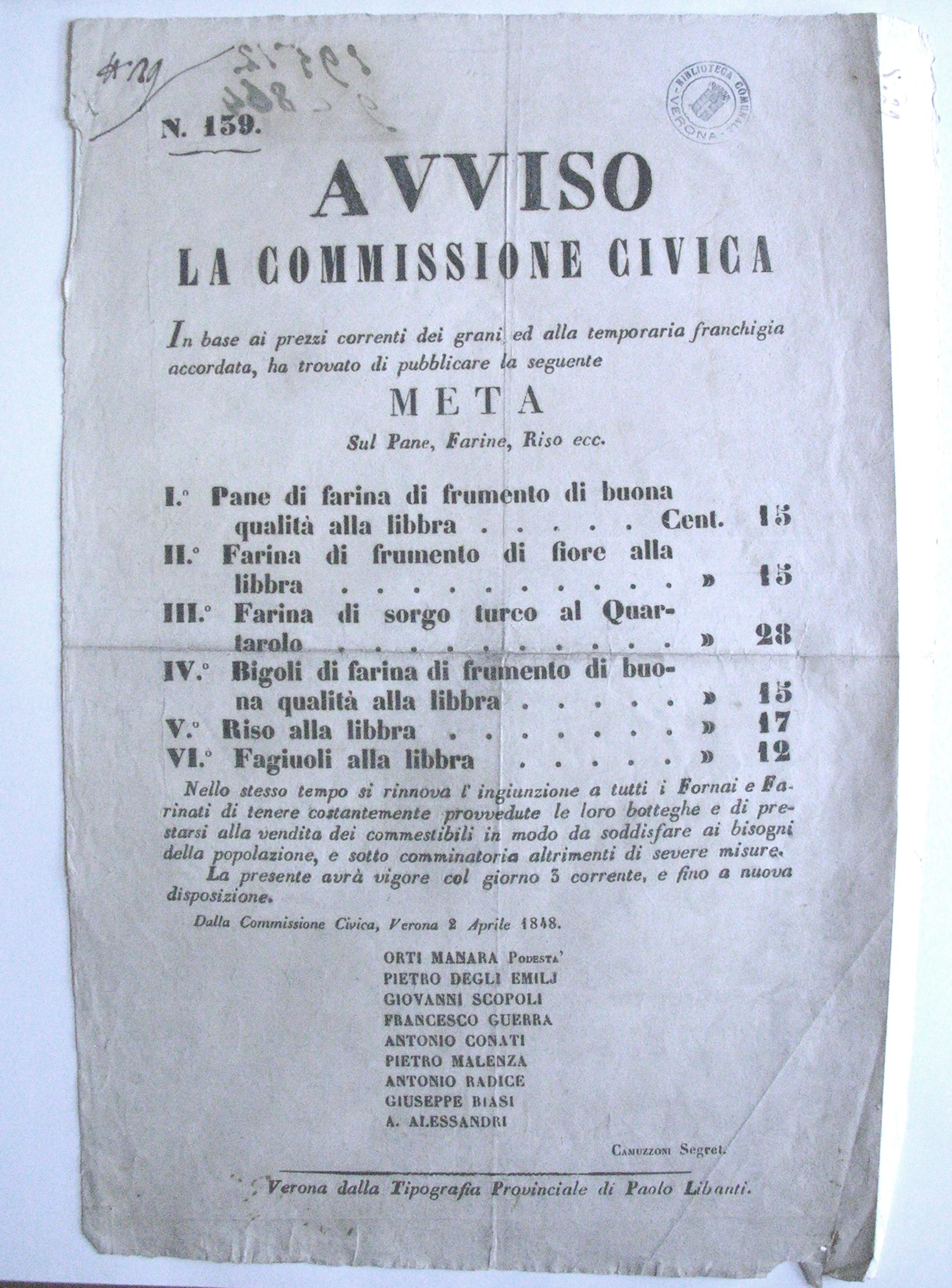 - Avviso della Commissione Civica circa i prezzi di pane, farine, riso..