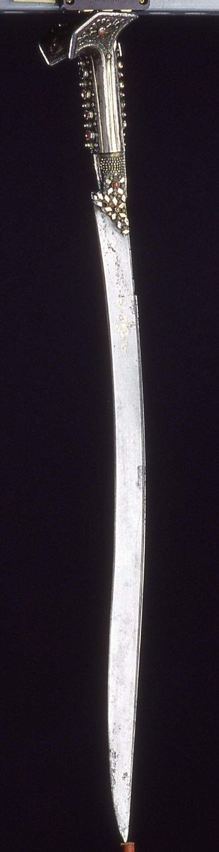 - La lama, a un filo e punta, è a doppia curvatura con stretto sguscio al dorso. Il fornimento in argento massiccio, privo di guardia, è composto dalla caratteristica impugnatura a grandi orecchie con ghiera e alette che coprono trasversalmente il tallone della lama (manca la lamina che copriva il dorso del tallone). Il tutto è decorato a niello e in filigrana con pinnaccoli e con coralli incorporati. Il fodero è in legno rivestito con resti di cuoio nero con cucitura metallica e ha la cappa e il puntale in argento decorato alla stessa maniera dell'impugnatura. Il puntale termina a testa di animale fantastico.