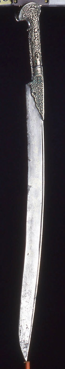- La lama, a un filo e punta, è a doppia curvatura con stretto sguscio al dorso e reca decorazioni ad agemina in oro. Il fornimento in argento lavorato a motivi floreali è composto dalla caratteristica impugnatura a orecchie con ghiera e alette che coprono trasversalmente il tallone della lama. Il fodero è in legno rivestito di cuoio annerito con cappa e lungo puntale in argento lavorato alla maniera del fornimento. Il cuoio, sul lato interno, presenta una spessa cucitura in metallo.