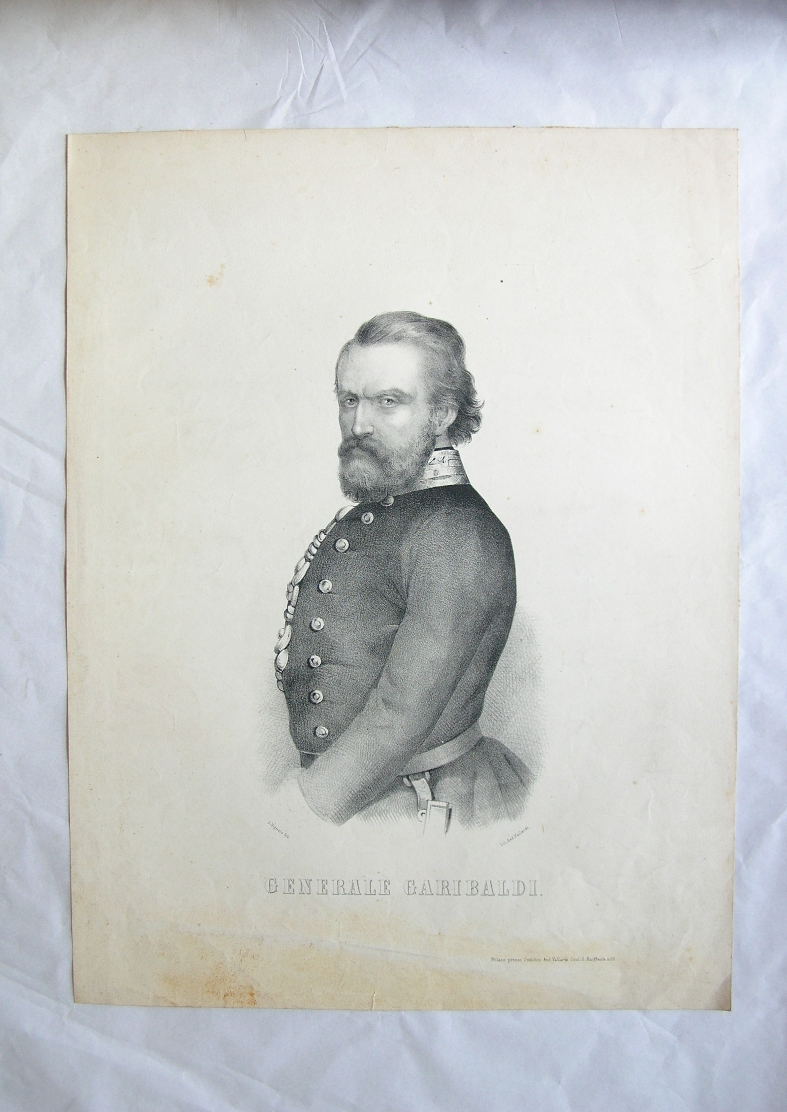 Sotto l'immagine: "GENERALE GARIBALDI." e in calce a destra: "Milano, presso l'Editore Ant. Vallardi, cont. s. Margherita n° 10".