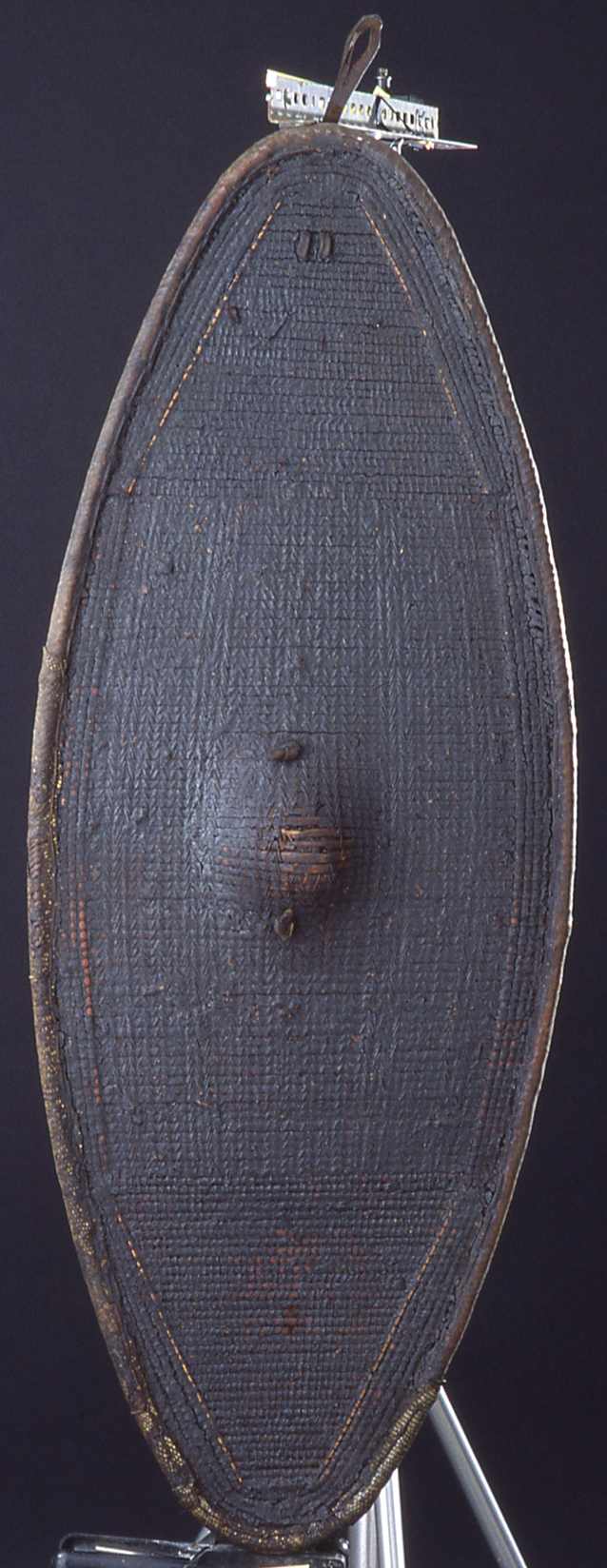 - Scudo di forma ovale in vimini tinto di nero, su struttura in bambù con accenno di umbone ricavato nella struttura stessa dello scudo e generato dall'impugnatura applicata internamente; la maniglia è ricavata per asportazione di materiale da una tavola ovale (lunga circa la metà della lunghezza dell'intero scudo e larga poco meno dello stesso) coperta da un rivestimento in vimini intrecciato a spina di pesce.